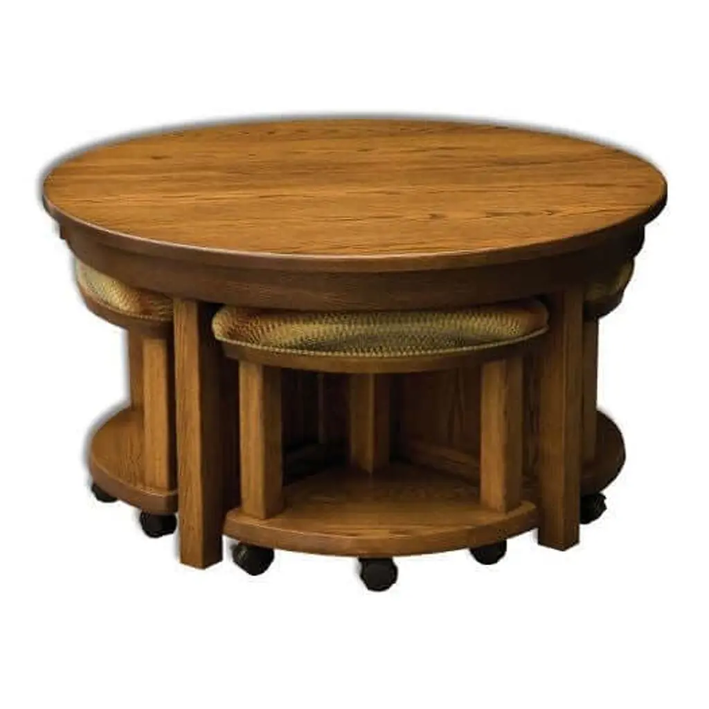 The Amish 5 Piece Round Table Bench set can be used as a coffee table and then the top lifted to be used as a dining area. The 5 Piece Square version featuring storage benches is shown below.