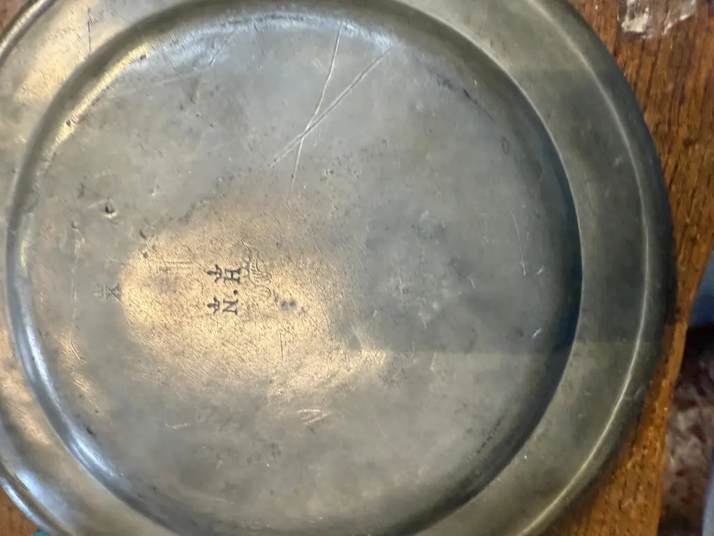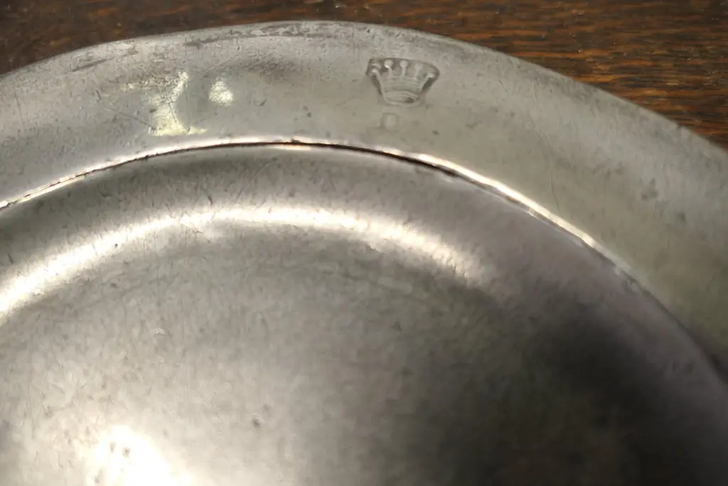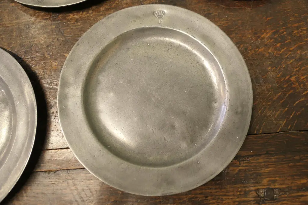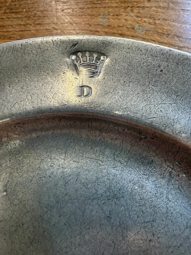 5 Pewter Chargers, Embossed with a “Crown over D”Antique English pewter plates, the front rim is engraved with a Crown over the Letter D, on the underside they all have the same touch marks4 of the plated are in acceptable antique condition, the other one has a spit all around the rimThe Plates are 9.5” in diameterAW133