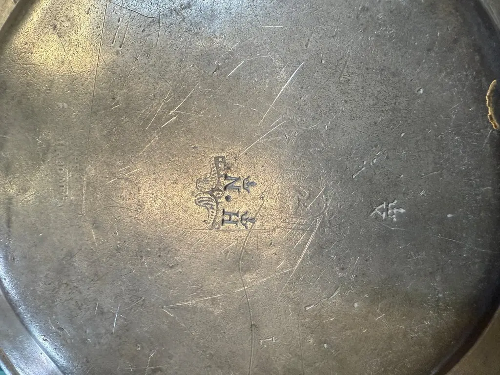 5 Pewter Chargers, Embossed With A “Crown Over D” Antique