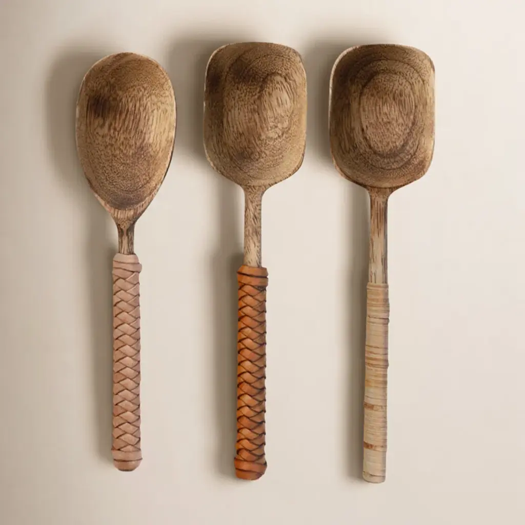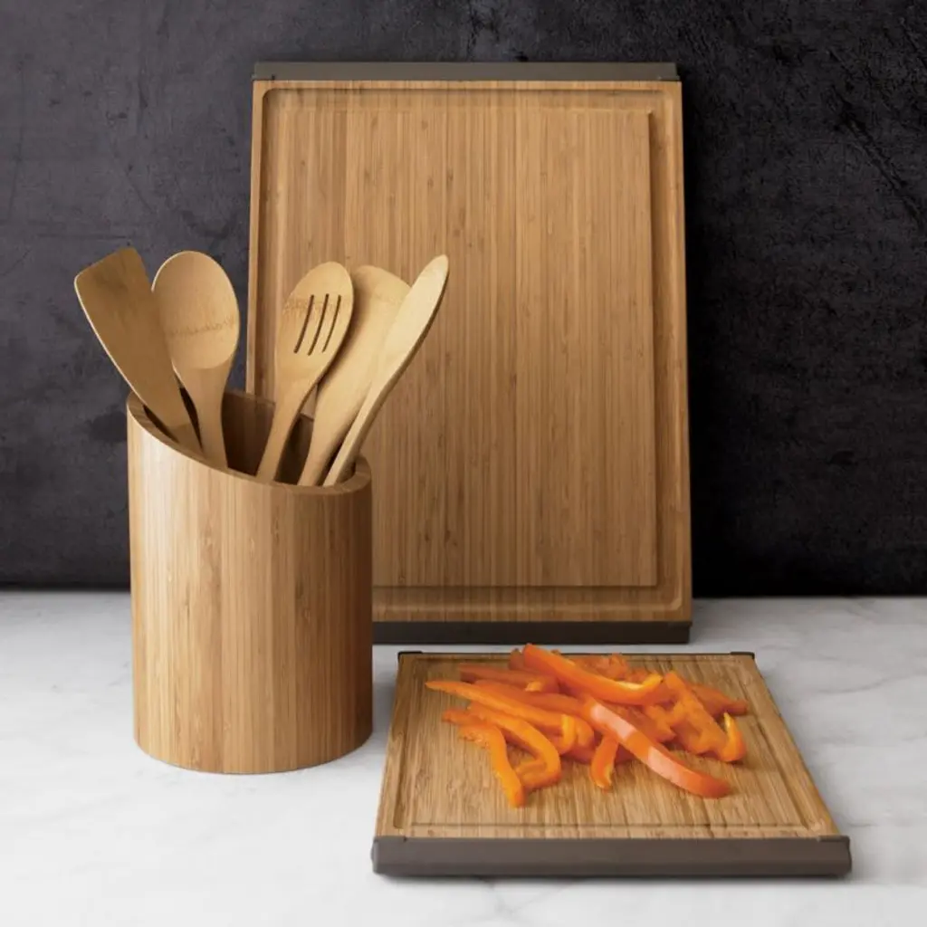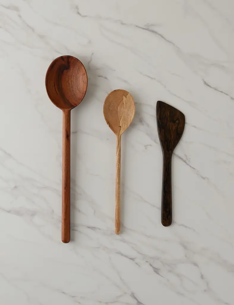 Bamboo utensils are each handcrafted from a single stalk, then burnished to a smooth, satiny finish. Stronger than wood, they will not harm fine cookware or take on odors or flavors. Set includes two turners, two cooking wooden spoons and one slotted spoon.Check out our favorite list of kitchen tools equipment.