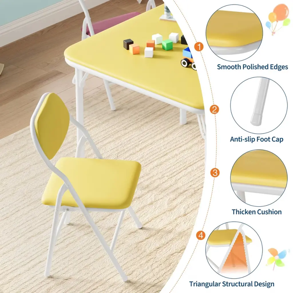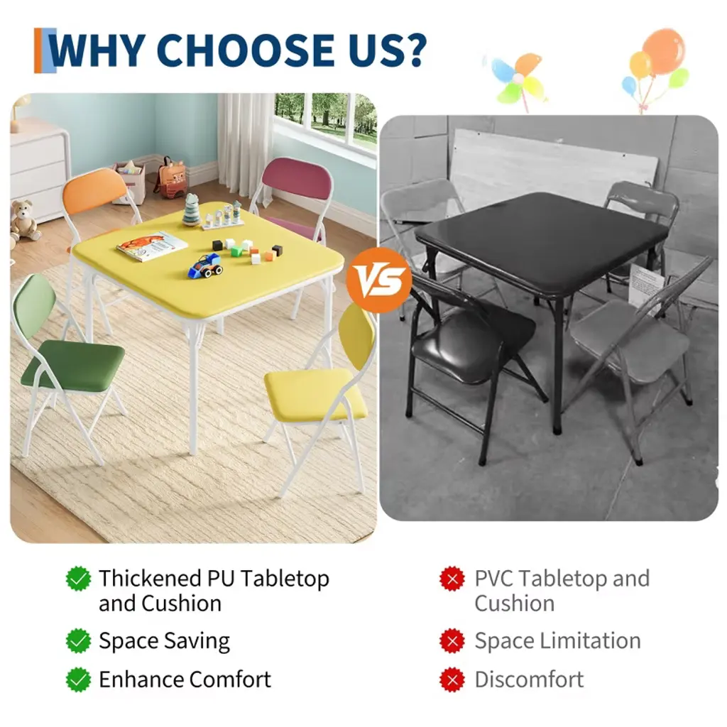 【5 Piece Kids Table and Chairs Set】The kids table and chairs are designed for boys and girls, it includes a table and 2 chairs to provide place to enjoy meals,arts, learning, painting, and games. 【Durable Material】 Our kids folding table and chairs use premium metal frame with a painted surface. It is rustproof and wear-resistant, with rounded edges and no burrs. The table top and chair surfaces is made with thicken PU leather, which are very soft, skin-friendly, waterproof, stain-resistant and easy to clean. 【Safe and Stable】The table and chairs adopt thoughtful rounded corner design, and the table legs, chair backs and edges are polished into smooth arcs to prevent from bumping and scratching; the folding joints have a built-in anti-pinch finger structure, which is smooth to operate, stable and safe, and parents can feel more at ease. 【Easy to Use】The table and chairs are foldable and no need to assemble. After folding, it is easy to store it in a small space, and you can take it out whenever you need it, saving time and effort. 【Multiple Scenario】This children's folding tables and chairs is convenient and flexible, suitable for children's rooms,study corners, balcony game areas, kindergarten nap rooms and other kids activity areas, and can also be used in outdoor camping and picnics, meeting multiple needs such as learning, painting, and gatherings.