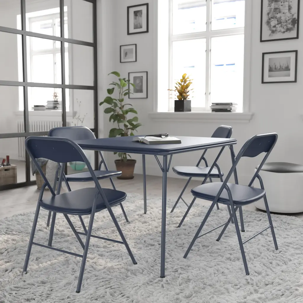 Host all those upcoming events with ease when you have this 5 Piece Folding Card Table and Chair Set. This set is a convenient solution for times when you have more guests than table settings. This folding card table is the perfect size for card and board games to get the family involved or to host game night. The 5 piece set includes 4 metal padded folding chairs and a square folding table. The table top is padded to help slow down thrown cards from sliding off the table. Powder coating protects the legs from scratches while plastic floor glides protect your floor by sliding smoothly.This classic set comes in handy when you need additional table settings for family get-togethers or for poker night in the man cave. It can be used indoors or outside and is lightweight and easy to fold up, transport and store.
