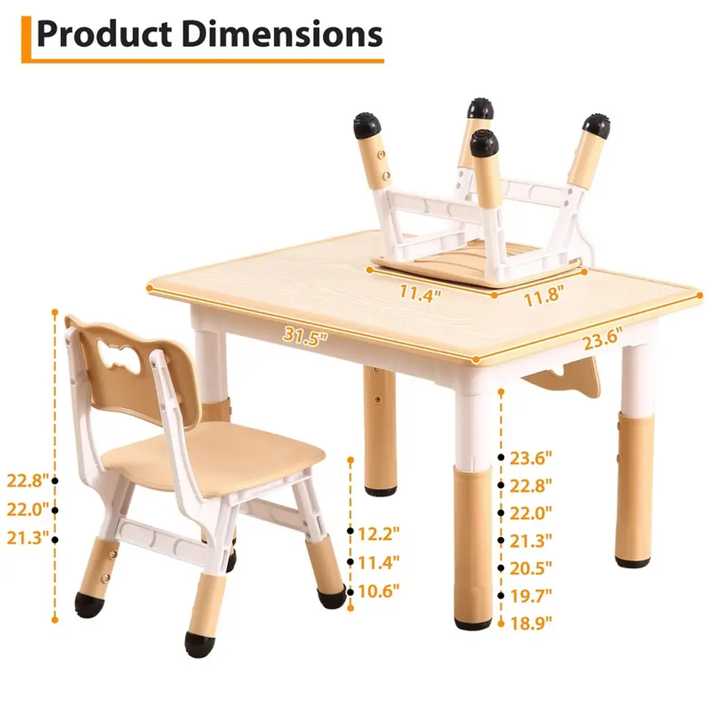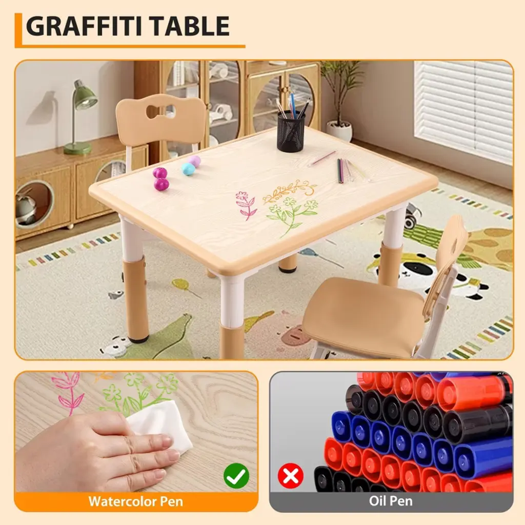 Description:Create a special space where your child can learn, play, and grow with this thoughtfully designed kids table and chairs set, perfect for ages 2 to 10. Featuring an adjustable table height from 18.9" to 23.6" and chairs with three height options, it adapts as your little one grows, providing comfort and support through every stage. Crafted with safety in mind, the set includes rounded corners, a raised table edge to keep supplies in place, ergonomic chairs with curved backrests, and sturdy non-slip legs supporting up to 300 lbs. The smooth, premium graffiti desktop is easy to clean, encouraging creativity without the worry of stains or mess. Whether for arts and crafts, mealtime, reading, or tablet use, this versatile 5-piece set offers a fun and practical space for toddlers and children ages 2 to 10. Easy to assemble with clear instructions, it's perfect for classrooms, daycares, or your home's playroom, fostering unforgettable moments and inspiring your child's imagination every day.