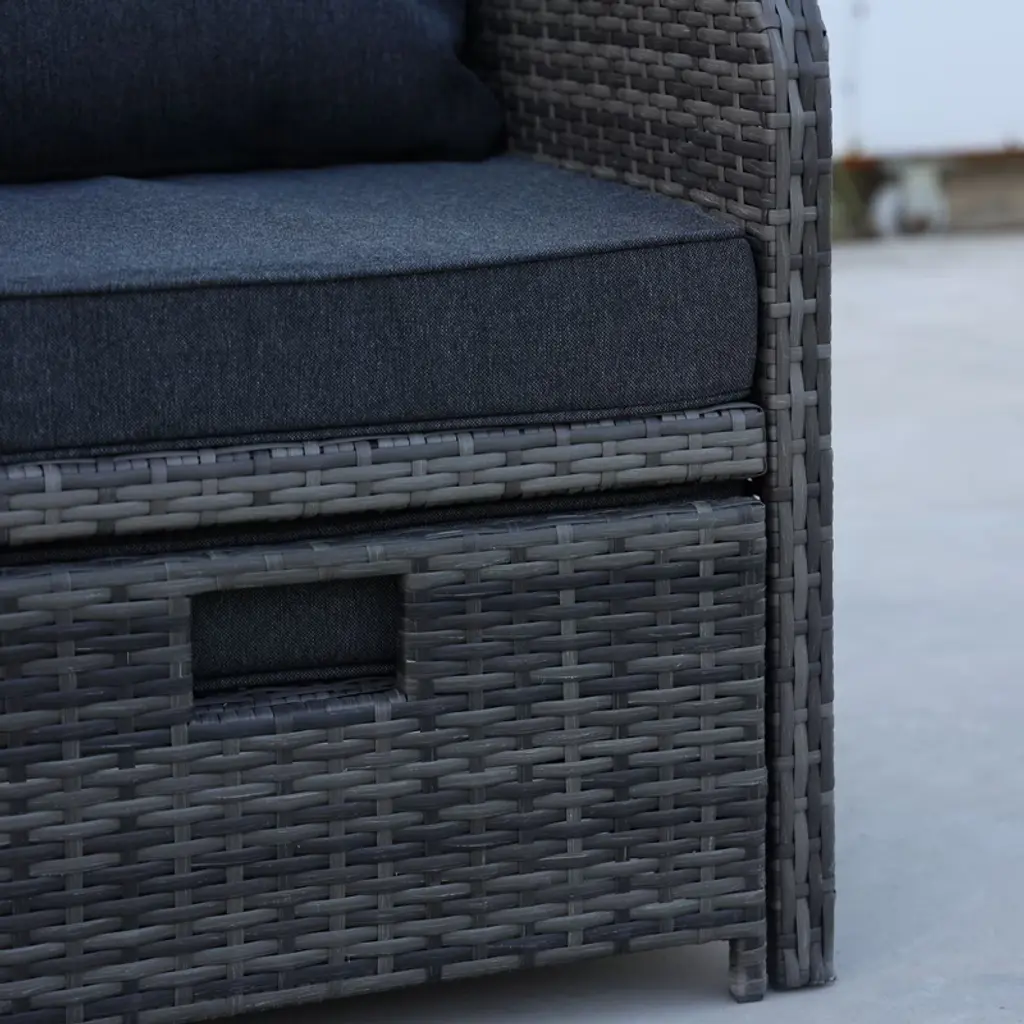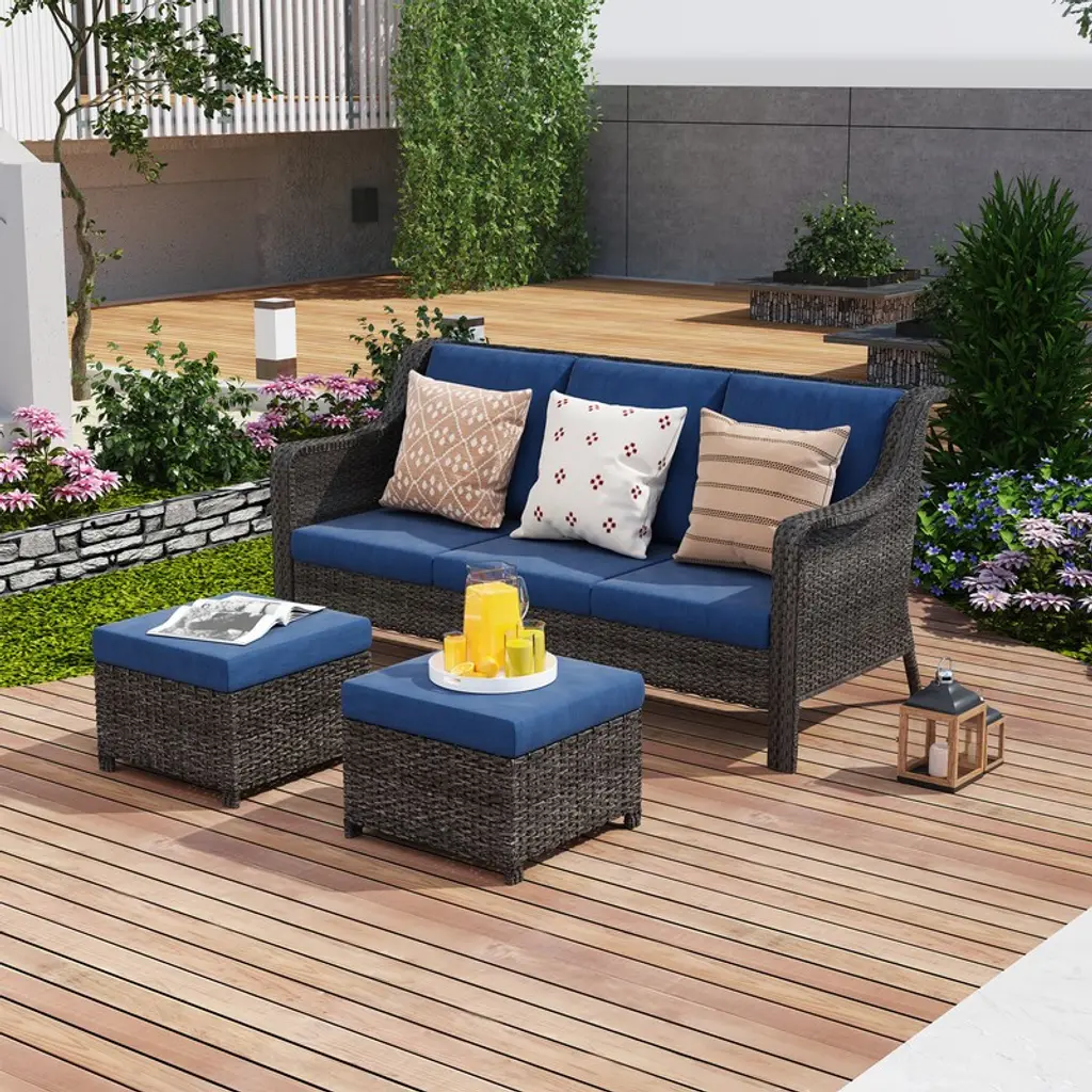 Luxurious & Comfortable: 5-piece patio furniture set includes 2 single chairs, 2 ottomans and 1 coffee table. Each patio sofa can support up to 330 pounds. Large ottomans provide you with a comfortable place to restRobust and Long-Lasting: The porch furniture set is designed with a sturdy and rust-proof frame to provide enhanced support and durability. Crafted with all-weather plastic hand-woven PE wicker, it is waterproof and UV-resistant, ensuring a superior user experienceSpace Saving Design: The ottoman of our wicker patio conversation chairs set is cleverly designed to be tucked under the chair, maximizing space efficiency. By storing it under the chairs when not in use, you can greatly reduce the amount of space it takes up. If you're in need of a patio rattan furniture set that will save you valuable space, look no further than this 5-piece wicker furniture setSoft Psdded CushionsL: Our cushions are filled with high-density sponge, ensuring a comfortable sitting experience. In addition, they are designed with waterproof properties (Note: Not Rain-Proof)Easy Assembly: Our wicker patio furniture is designed for quick and hassle-free installation. To ensure the product's safety during shipping, it will be delivered in one separate boxes