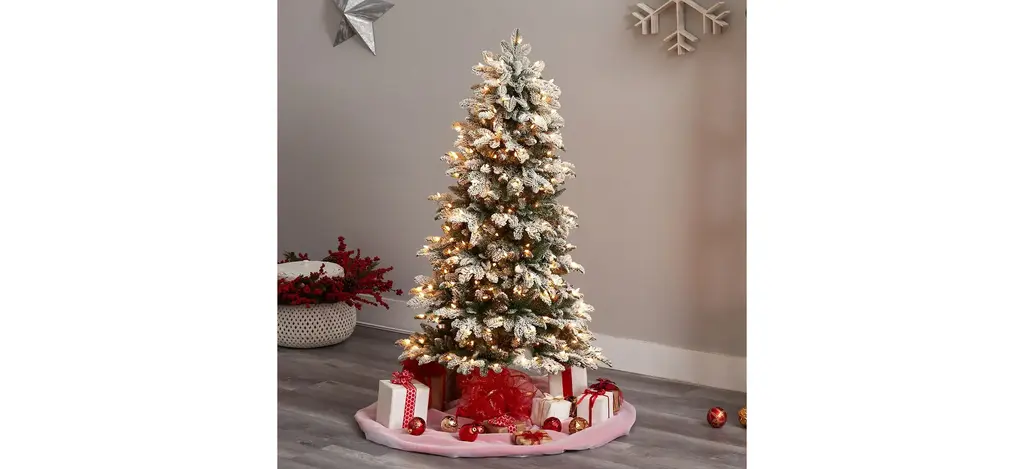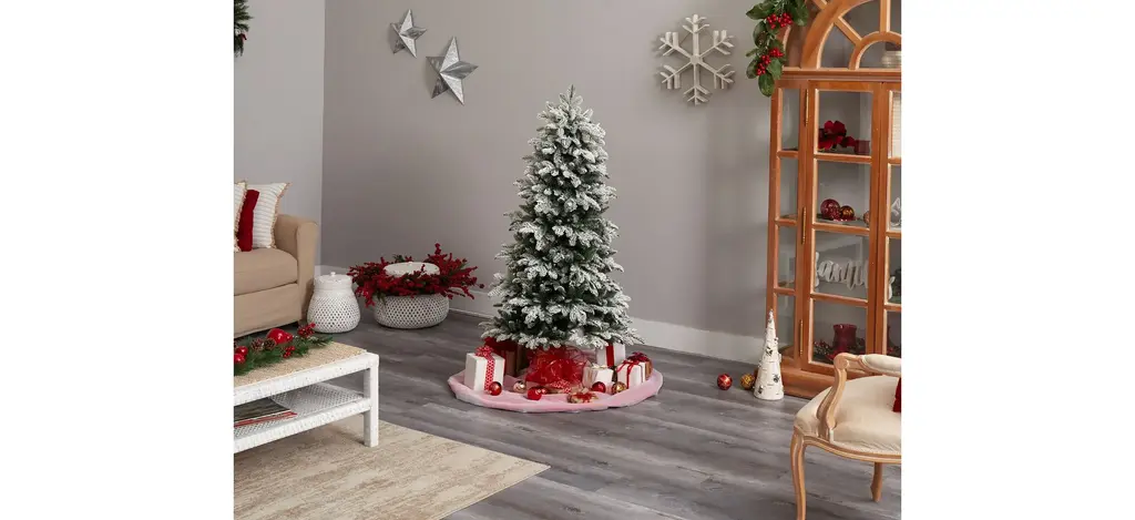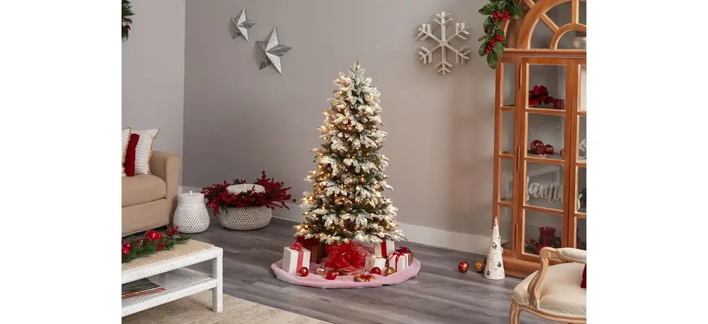 Create a winter-inspired Christmas scene without the hassle of upkeep or maintenance with the help of the 5' Pre-Lit Flocked North Carolina Fir Artificial Tree. Perfect for tight, narrow spaces because of its slim silhouette