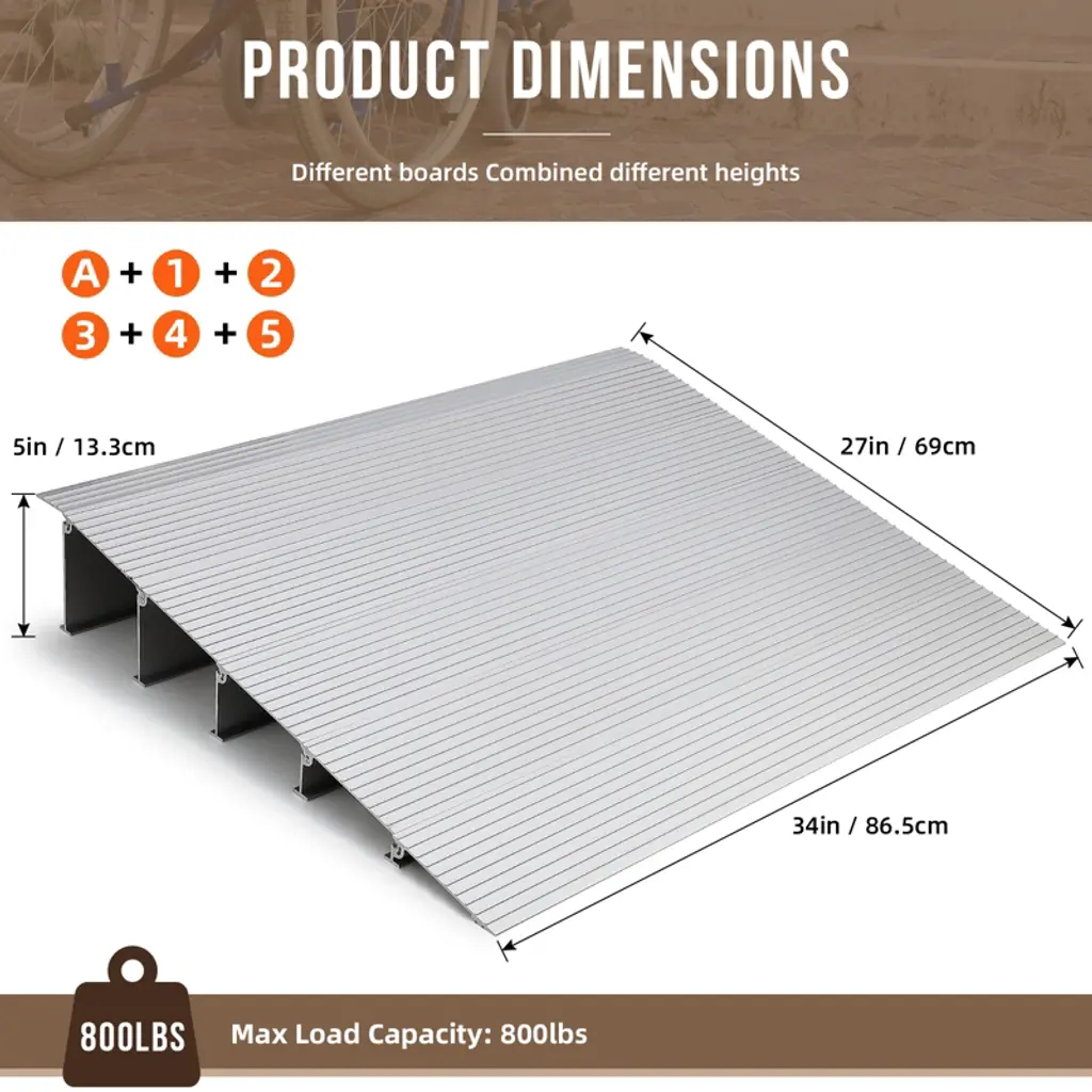 5" Rise Door Threshold Ramp, Aluminum Portable Self Supporting Ramp, 800lbs Load Capacity, Non-slip Surface, Adjustable Telescoping Design