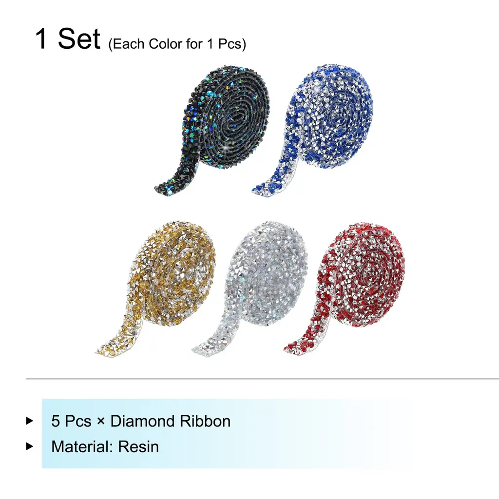 What is this?Crystal belts can mainly be used to decorate different occasions and items in your life. You can use it for decoration of furniture, cakes or handicrafts, and you can also use it for decoration on different parties, such as weddings, birthday parties, and other holidays, etc.What will I get?Color: Rainbow Color,Silver Base Yellow,Silver Base Red,Rainbow Black,Silver Base BlueMaterial: ResinEach Size(L*W):90cm x 1cm/1 Yards x 0.39 inches;In the package of: 5 Roll x Diamond RibbonAre there any advantages of the product?1. This crystal ribbon is made of resin, using good craftsmanship to make all the surfaces shine, smooth and flat, and they are bling no matter under natural light or light.2. The resin diamond ribbon has a double-sided tape, you can cut the size you want according to your needs, directly tear off the tape on the back during use, and stick it directly on the surface of the item.3. The decoration sticker are not easy to fall off, and the adhesive performance is stable. You can use it to easily stick to the surface of the itemsHow to use it?You just need to cut the diamond gems sticker to the length you need and use it to diy your items. Wipe the surface of the item before use, then tear off the adhesive sticker and stick it onWhat should I notice?Within 48 hours of use, do not let the craft come into contact with liquids