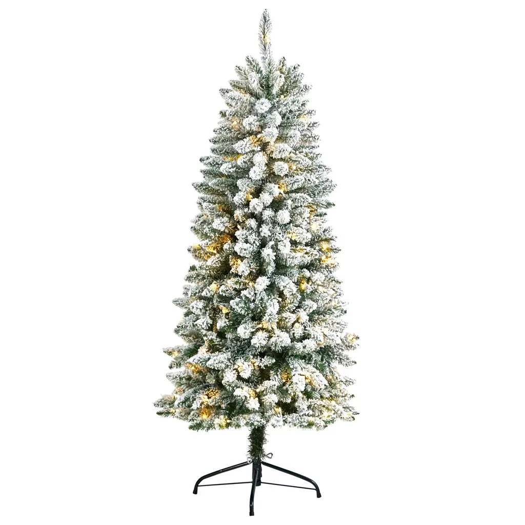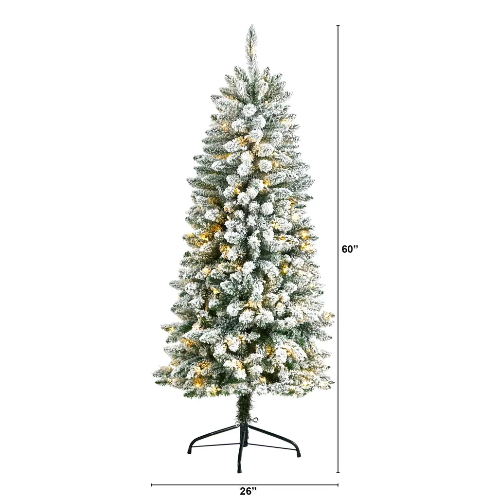 Transform your home into an enchanting winter wonderland with this flocked Artificial Christmas Tree. If you dream of a white Christmas, these artificial trees are designed to mimic the texture and foliage of real trees with their upward sloping branches that can easily house mini ornaments. Pre-strung with 150 LED lights for a warm, candle-like glow, all that's missing are your ornaments. Standing at 5' from a metal stand (included in height), this flocked tree complements compact spaces that need some Christmas love. Everyone can have a white Xmas even if they live in the tropics.