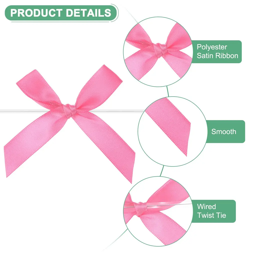 PRODUCT APPLICATIONSOur ribbon bows and twist ties have various applications. They can be used in the hemming and decoration of handcrafts, gift bags, bakery candy bags, present bags and box decorations, bags, sleeping bags, tents, and clothing. Because polyester ribbons are soft, they are mostly used for the hemming of softer fabrics.PRODUCT DETAILS & INCLUDE√ Material: Polyester√ Color: White√ Overall Size: 6x7cm/2.36x2.76 Inch(L*W); Ribbon Width: 1.5cm/0.59 Inch√ Package Includes:50-Pack x Ribbon Bows Twist Tie for Baked GoodsPRODUCT ADVANTAGES1. Crafted from polyester plastic, our craft ribbon bows twist tie appliques offer fine texture, high washing fastness, no fading, smooth and wrinkle-resistant, and flexible to the touch.2. Our satin ribbon bow twist tie features a classic design, the product is bright in color, fashionable and new in design, and can be used on many occasions. It is suitable for hair accessories, clothing, Christmas gifts, baking decorations, gift box packaging, hotel decorations, wedding decorations, flower packaging, birthday arrangements, etc.INSTALLATION1. Choose the color of the Mini Ribbon Bow that matches your project or gift wrapping paper.2. Use twist ties (not included here) or glue to secure the mini ribbon bows twist tie to desired surfaces such as gift boxes, cards, or crafts.3. Adjust the position of the bow if necessary to get the desired look.