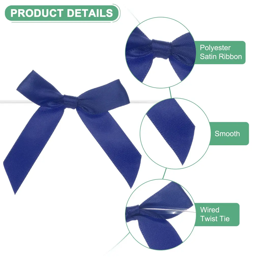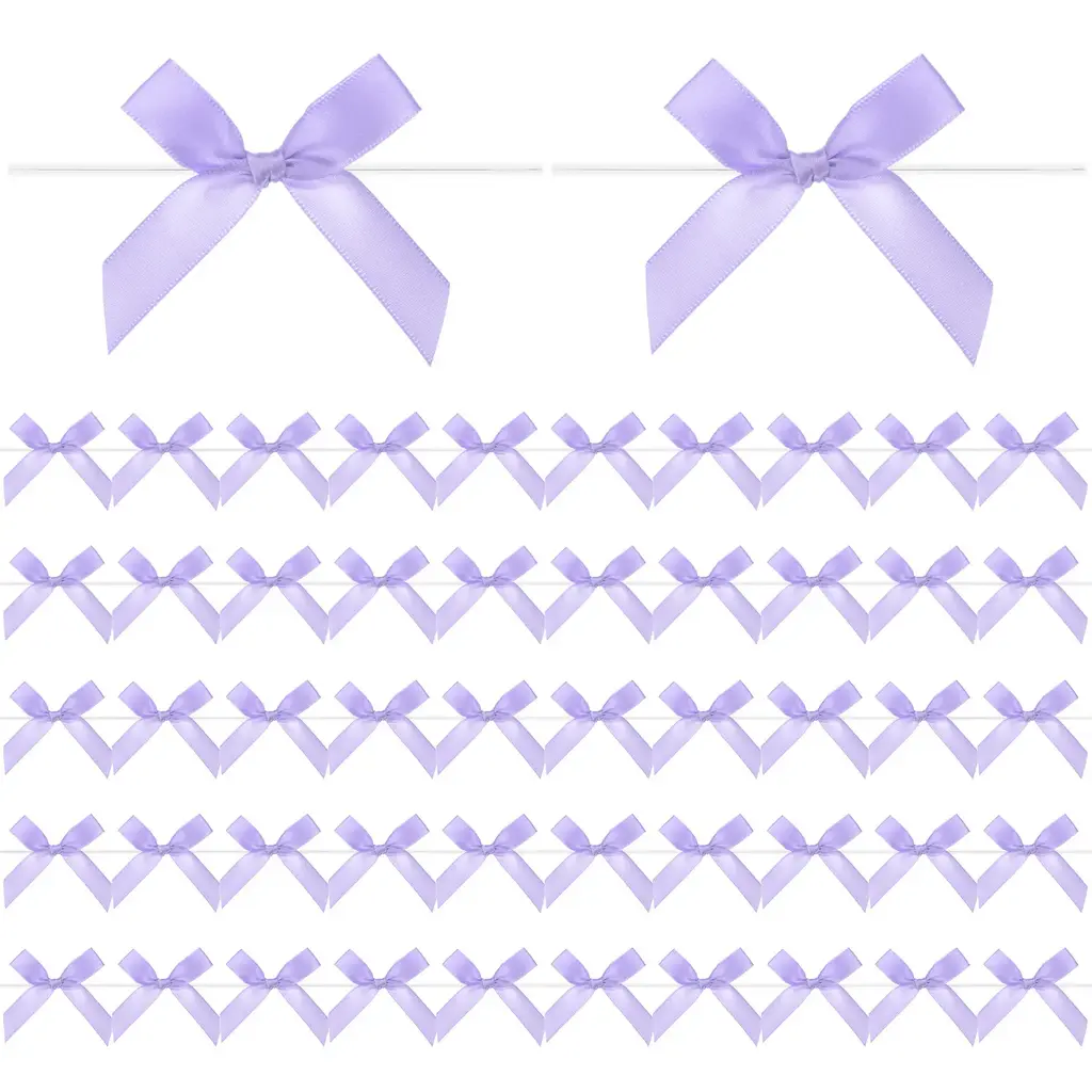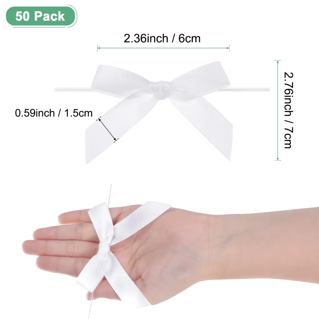 PRODUCT APPLICATIONSOur ribbon bows and twist ties have various applications. They can be used in the hemming and decoration of handcrafts, gift bags, bakery candy bags, present bags and box decorations, bags, sleeping bags, tents, and clothing. Because polyester ribbons are soft, they are mostly used for the hemming of softer fabrics.PRODUCT DETAILS & INCLUDE√ Material: Polyester√ Color: White√ Overall Size: 6x7cm/2.36x2.76 Inch(L*W); Ribbon Width: 1.5cm/0.59 Inch√ Package Includes:50-Pack x Ribbon Bows Twist Tie for Baked GoodsPRODUCT ADVANTAGES1. Crafted from polyester plastic, our craft ribbon bows twist tie appliques offer fine texture, high washing fastness, no fading, smooth and wrinkle-resistant, and flexible to the touch.2. Our satin ribbon bow twist tie features a classic design, the product is bright in color, fashionable and new in design, and can be used on many occasions. It is suitable for hair accessories, clothing, Christmas gifts, baking decorations, gift box packaging, hotel decorations, wedding decorations, flower packaging, birthday arrangements, etc.INSTALLATION1. Choose the color of the Mini Ribbon Bow that matches your project or gift wrapping paper.2. Use twist ties (not included here) or glue to secure the mini ribbon bows twist tie to desired surfaces such as gift boxes, cards, or crafts.3. Adjust the position of the bow if necessary to get the desired look.