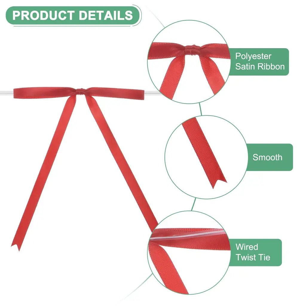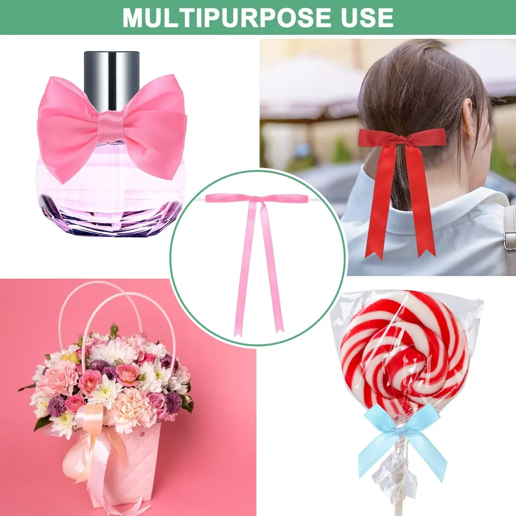 PRODUCT APPLICATIONSOur ribbon bows and twist ties have various applications. They can be used in the hemming and decoration of handcrafts, gift bags, bakery candy bags, present bags and box decorations, bags, sleeping bags, tents, and clothing. Because polyester ribbons are soft, they are mostly used for the hemming of softer fabrics.PRODUCT DETAILS & INCLUDE√ Material: Polyester√ Color: Pink√ Overall Size: 17.7x12.7cm/6.97x5 Inch(L*W); Ribbon Width: 1cm/0.39 Inch√ Package Includes:50-Pack x Ribbon Bows Twist Tie for Baked GoodsPRODUCT ADVANTAGES1. Crafted from polyester plastic, our craft ribbon bows twist tie appliques offer fine texture, high washing fastness, no fading, smooth and wrinkle-resistant, and flexible to the touch.2. Our satin ribbon bow twist tie features a classic design, the product is bright in color, fashionable and new in design, and can be used on many occasions. It is suitable for hair accessories, clothing, Christmas gifts, baking decorations, gift box packaging, hotel decorations, wedding decorations, flower packaging, birthday arrangements, etc.INSTALLATION1. Choose the color of the Mini Ribbon Bow that matches your project or gift wrapping paper.2. Use twist ties (not included here) or glue to secure the mini ribbon bows twist tie to desired surfaces such as gift boxes, cards, or crafts.3. Adjust the position of the bow if necessary to get the desired look.