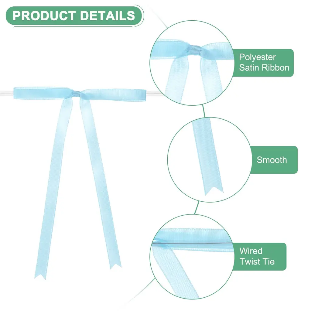 PRODUCT APPLICATIONSOur ribbon bows and twist ties have various applications. They can be used in the hemming and decoration of handcrafts, gift bags, bakery candy bags, present bags and box decorations, bags, sleeping bags, tents, and clothing. Because polyester ribbons are soft, they are mostly used for the hemming of softer fabrics.PRODUCT DETAILS & INCLUDE√ Material: Polyester√ Color: Pink√ Overall Size: 17.7x12.7cm/6.97x5 Inch(L*W); Ribbon Width: 1cm/0.39 Inch√ Package Includes:50-Pack x Ribbon Bows Twist Tie for Baked GoodsPRODUCT ADVANTAGES1. Crafted from polyester plastic, our craft ribbon bows twist tie appliques offer fine texture, high washing fastness, no fading, smooth and wrinkle-resistant, and flexible to the touch.2. Our satin ribbon bow twist tie features a classic design, the product is bright in color, fashionable and new in design, and can be used on many occasions. It is suitable for hair accessories, clothing, Christmas gifts, baking decorations, gift box packaging, hotel decorations, wedding decorations, flower packaging, birthday arrangements, etc.INSTALLATION1. Choose the color of the Mini Ribbon Bow that matches your project or gift wrapping paper.2. Use twist ties (not included here) or glue to secure the mini ribbon bows twist tie to desired surfaces such as gift boxes, cards, or crafts.3. Adjust the position of the bow if necessary to get the desired look.
