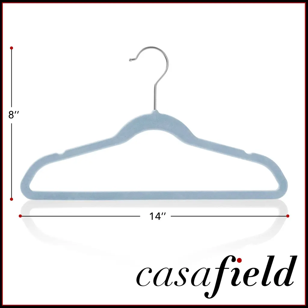 SET INCLUDES: 50 Velvet Flocked 14" Kids HangersMAXIMIZE YOUR CLOSET SPACE: Unclutter your kid's closet and add up to 50 percent more space with the ultra-thin profile of these slim, space-saving hangers from Casafield. LIGHTWEIGHT, STURDY DESIGN: Durable yet lightweight. Stylish yet practical. Our flexible children's hangers feature a shiny chrome hook with 360-degree swivel, which will not rust. Not only are they attractive, but our clothes hangers can hold up to 5 pounds, making them ideal for hanging everything as your child grows, from puffy winter coats to school uniforms to strappy summer dresses. EASY ON KID'S CLOTHES: The soft velvet flocking helps clothes maintain their shape. The textured fabric and precisely-cut shoulder notches secure strappy tanks, shirts and dresses with ease. The velvet flocked pant bar is designed to grip and prevent creasing, leaving their denim jeans, dress pants and skirts in place and no longer wrinkled on the closet floor. DOUBLE-DUTY DESIGN: Instantly organize and streamline your child's closet space with our velvet hangers. Hang tops, pants, or both on these perfectly sized kid's hangers from Casafield. Featuring 14-inch wide, contoured shoulders and a horizontal pant cross-bar design, the hanging and organizing possibilities are endless. Give you child's closet an instant makeover and organize the closet of your dreams with these non-slip, space-saving velvet flocked kids hangers from Casafield. Never again will you have to deal with their clothes slipping off, losing shape and becoming wrinkled due to the use of standard plastic or wire hangers. Maximize their closet space with the ultra-thin profile of these velvet flocked clothes hangers. The slim design of our kid's hangers free up to 50 percent more closet space.Our textured clothes hangers feature precisely cut notches and contoured shoulders gripping items like tank tops and strappy dresses with ease. These velvet kid's hangers from Casafield feature a horizontal cross-bar that securely grips jeans, pants, trousers, skirts and sweaters while preventing creases and clothing piles on the closet floor. The double-duty design is perfect for hanging both pants and tops together allowing you and your child to organize all their outfits making them ready to wear.The strong, 360-degree swivel hooks easily allow you to easily hang any garment in either direction. Our shiny chrome hooks also resist rusting for lasting use. Casafield velvet kid's hangers are designed to hold up to 5 lbs., making them great for hanging children's coats, outerwear, and much more.Dimensions:Overall: 14" x 1/4" x 8"Distance from pant bar to top of hook: 7-1/2"Using Your Hangers:These flexible, lightweight yet sturdy hangers combine luxurious design with an affordable value for lasting performance. Before the first use, we recommend that you rinse your hangers under cold water for 30 seconds to remove any residue and then lightly twist the hook to engage the swivel. We do not recommend using our velvet flocked hangers to hang-dry wet clothing and other laundered items.Casafield is an industry leader in affordable home accessories and organizational solutions perfect for any style and budget.