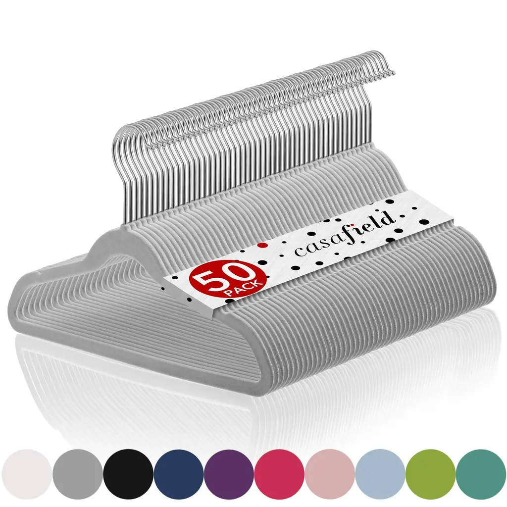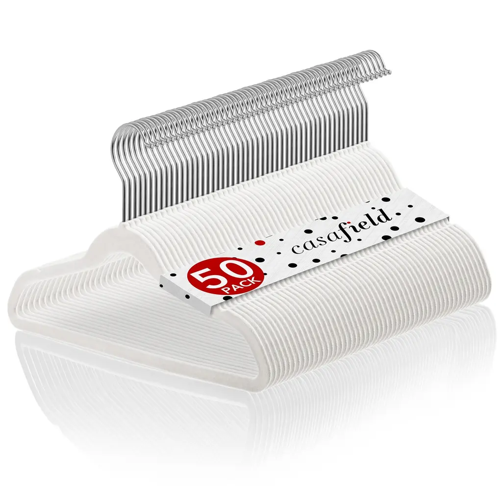 SET INCLUDES: 50 Velvet Flocked 14" Kids HangersMAXIMIZE YOUR CLOSET SPACE: Unclutter your kid's closet and add up to 50 percent more space with the ultra-thin profile of these slim, space-saving hangers from Casafield. LIGHTWEIGHT, STURDY DESIGN: Durable yet lightweight. Stylish yet practical. Our flexible children's hangers feature a shiny chrome hook with 360-degree swivel, which will not rust. Not only are they attractive, but our clothes hangers can hold up to 5 pounds, making them ideal for hanging everything as your child grows, from puffy winter coats to school uniforms to strappy summer dresses. EASY ON KID'S CLOTHES: The soft velvet flocking helps clothes maintain their shape. The textured fabric and precisely-cut shoulder notches secure strappy tanks, shirts and dresses with ease. The velvet flocked pant bar is designed to grip and prevent creasing, leaving their denim jeans, dress pants and skirts in place and no longer wrinkled on the closet floor. DOUBLE-DUTY DESIGN: Instantly organize and streamline your child's closet space with our velvet hangers. Hang tops, pants, or both on these perfectly sized kid's hangers from Casafield. Featuring 14-inch wide, contoured shoulders and a horizontal pant cross-bar design, the hanging and organizing possibilities are endless. Give you child's closet an instant makeover and organize the closet of your dreams with these non-slip, space-saving velvet flocked kids hangers from Casafield. Never again will you have to deal with their clothes slipping off, losing shape and becoming wrinkled due to the use of standard plastic or wire hangers. Maximize their closet space with the ultra-thin profile of these velvet flocked clothes hangers. The slim design of our kid's hangers free up to 50 percent more closet space.Our textured clothes hangers feature precisely cut notches and contoured shoulders gripping items like tank tops and strappy dresses with ease. These velvet kid's hangers from Casafield feature a horizontal cross-bar that securely grips jeans, pants, trousers, skirts and sweaters while preventing creases and clothing piles on the closet floor. The double-duty design is perfect for hanging both pants and tops together allowing you and your child to organize all their outfits making them ready to wear.The strong, 360-degree swivel hooks easily allow you to easily hang any garment in either direction. Our shiny chrome hooks also resist rusting for lasting use. Casafield velvet kid's hangers are designed to hold up to 5 lbs., making them great for hanging children's coats, outerwear, and much more.Dimensions:Overall: 14" x 1/4" x 8"Distance from pant bar to top of hook: 7-1/2"Using Your Hangers:These flexible, lightweight yet sturdy hangers combine luxurious design with an affordable value for lasting performance. Before the first use, we recommend that you rinse your hangers under cold water for 30 seconds to remove any residue and then lightly twist the hook to engage the swivel. We do not recommend using our velvet flocked hangers to hang-dry wet clothing and other laundered items.Casafield is an industry leader in affordable home accessories and organizational solutions perfect for any style and budget.