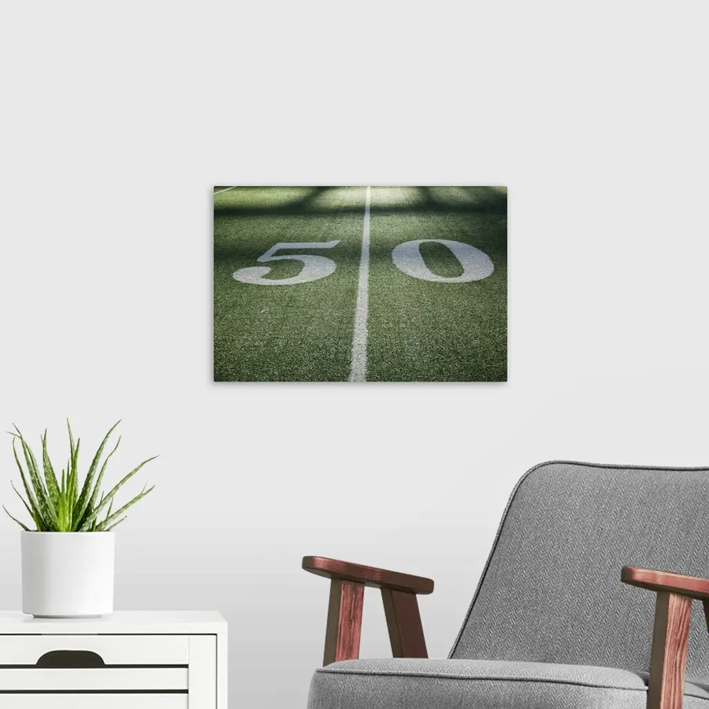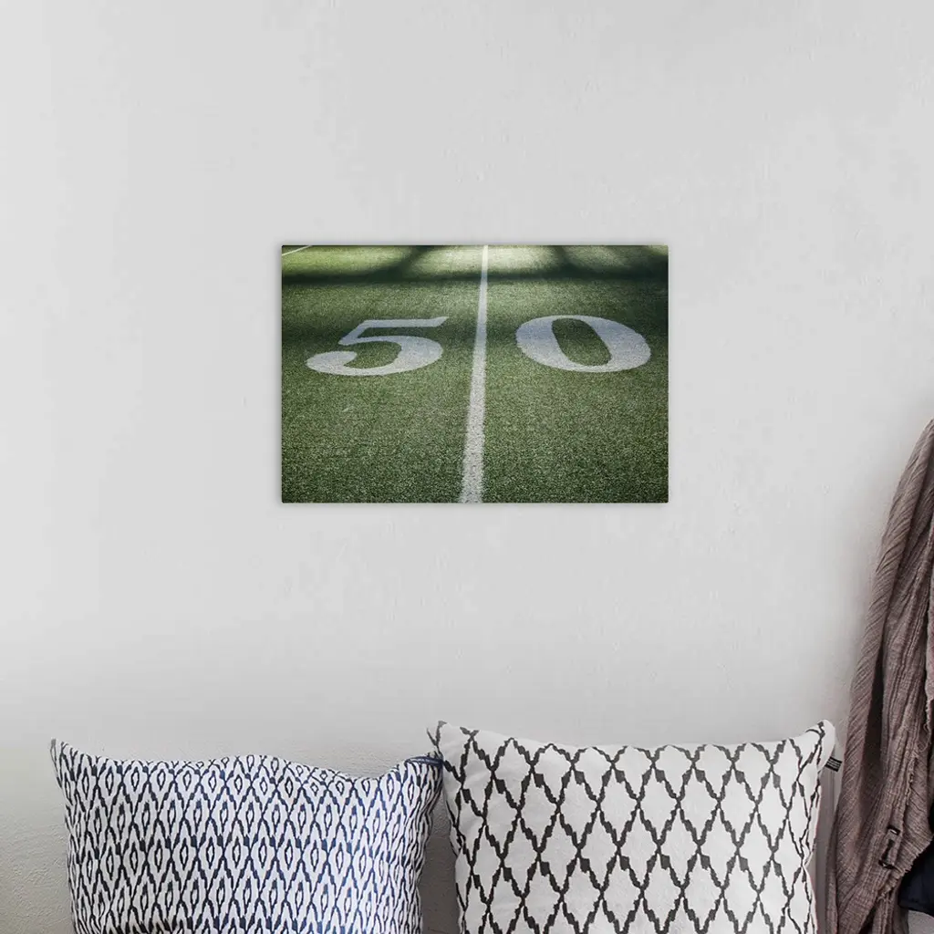 50 yard line marker in American Football stadium wall art for home and office decor. Discover canvas art prints, photos, mural, big canvas art and framed wall art in GreatBigCanvas.com's varied collections.