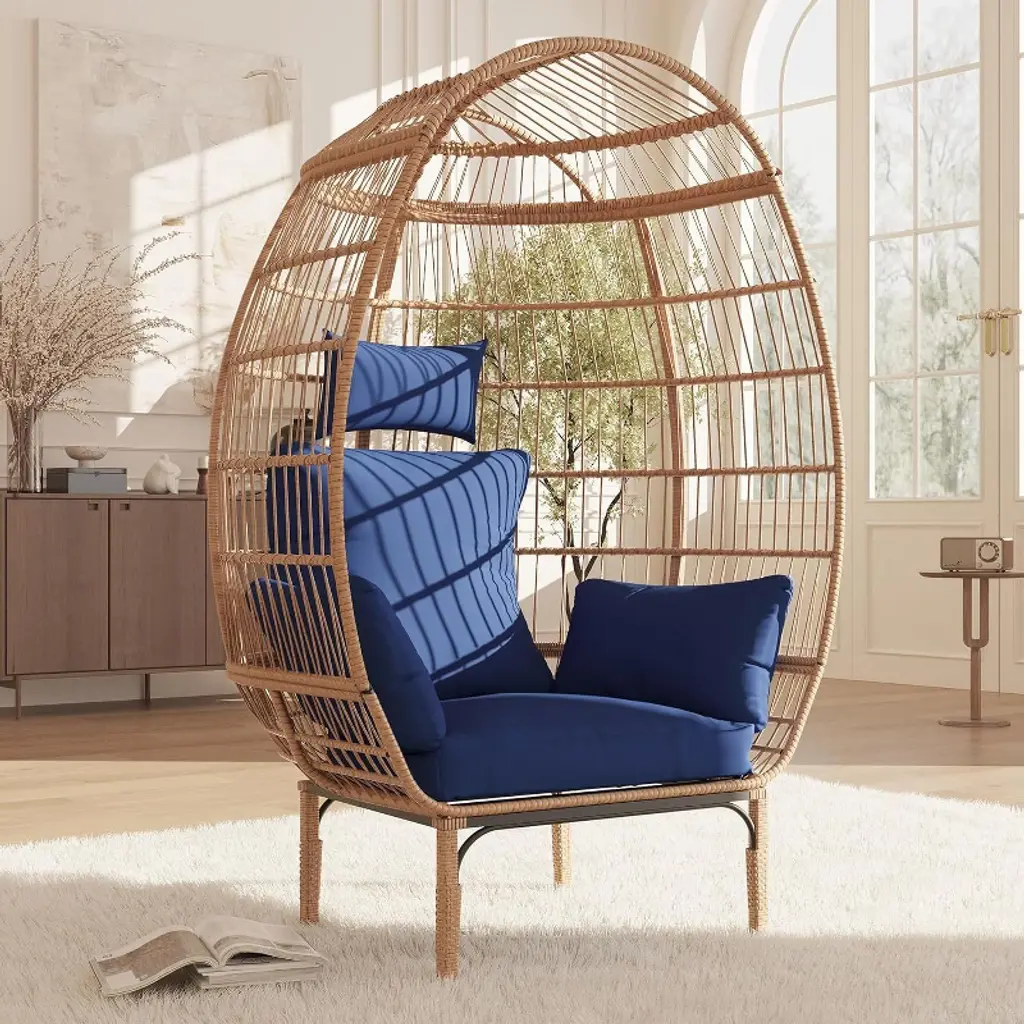 THICK AND DURABLE CUSHION - Five movable cushions (including an extra neck cushion) are filled with extra thick padding. They won't fade when exposed to water or different weather conditions. These cushions are not only washable (thanks to the convenient zipper design!) but also breathable, extremely comfortable, and fade resistant. Whether you're relaxing indoors or sunbathing outdoors, these cushions can elevate your relaxation experience to a perfect combination of comfort and style HIGH CAPACITY - An extra wide opening provides ample overhead space for taller people, while a large seat allows you to curl up comfortably with your favorite books or media devices. OVERALL DIMENSIONS: 37.8"(L) x 31.5"(W) x 56.3"(H); WEIGHT CAPACITY: 500lbs IDEAL FOR INDOOR AND OUTDOOR USE - Our egg chair wicker is not just for indoor use; it also works great in the backyard, on the patio, balcony, in the garden, by the poolside, in the living room, bedroom, or sunroom, etc. From the living room to the yard, no matter what space you use to relax, our egg shape chair offers a versatile style. Our patio egg chair, with its 4 inch cushion, provides you with a comfortable seating experience for a long time. It is light and breathable SPACIOUS WICKER EGG CHAIR OUTDOOR - The oversized wicker egg chair with legs is crafted from hand woven PE rattan. This outdoor egg chair is built to withstand the elements. It is corrosion resistant and has exceptional durability, ensuring that it will last for years to come. Boasting a seat that is a generous 37.8 inches wide and 30 1/4 inches deep, this outdoor patio egg chair provides ample room for you to lie back and relax ERGONOMIC DESIGN - This oval, freestanding rattan outdoor egg chair is all about maximum comfort. The soft curves and padding are like a warm hug for your body, providing excellent support so you can laze around for hours without feeling any discomfort