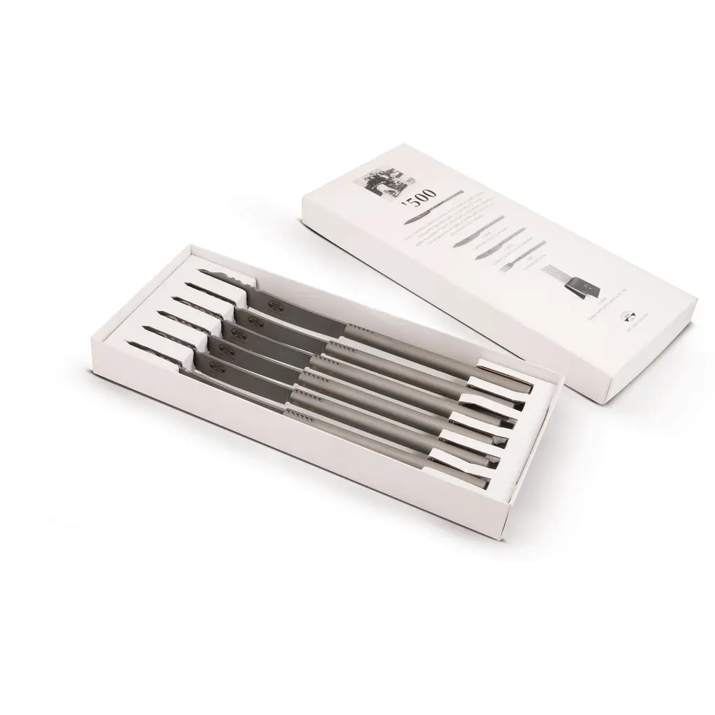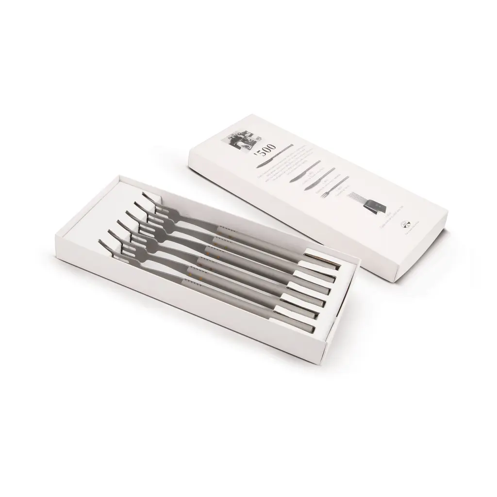 The ‘500 Collection’ table knife and fork set offers a contemporary reinterpretation of a Florentine design from the late medieval period. Featuring a unique aesthetic, this set enhances the dining table with a refined touch, allowing elegant cutting of any dish. The smooth blade ensures precise cuts, preserving both the flavor and appearance of the food. This set comes in a convenient 6-piece cardboard box, making it an ideal choice for those who appreciate both history and modern functionality in their dining utensils.