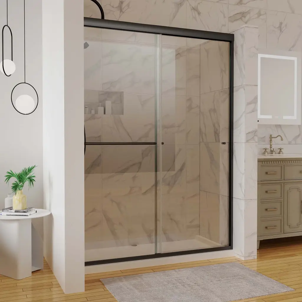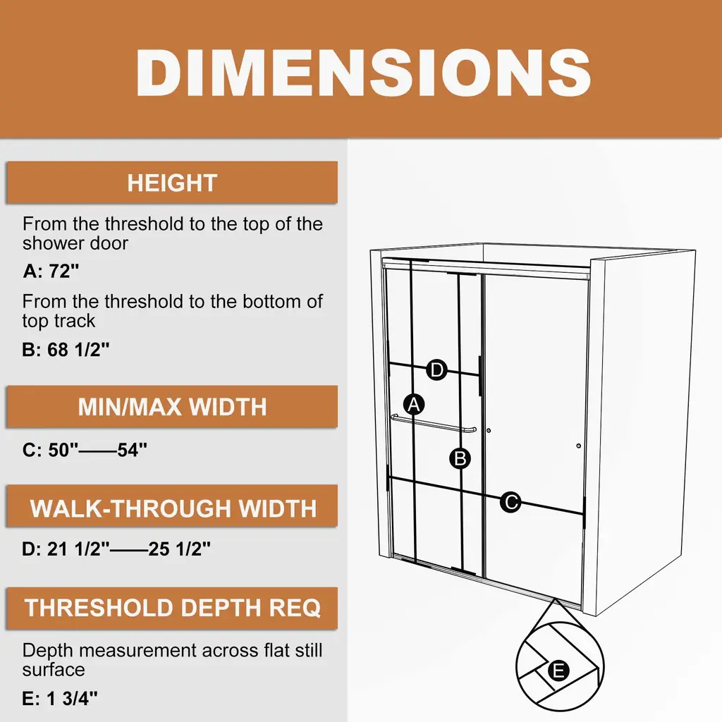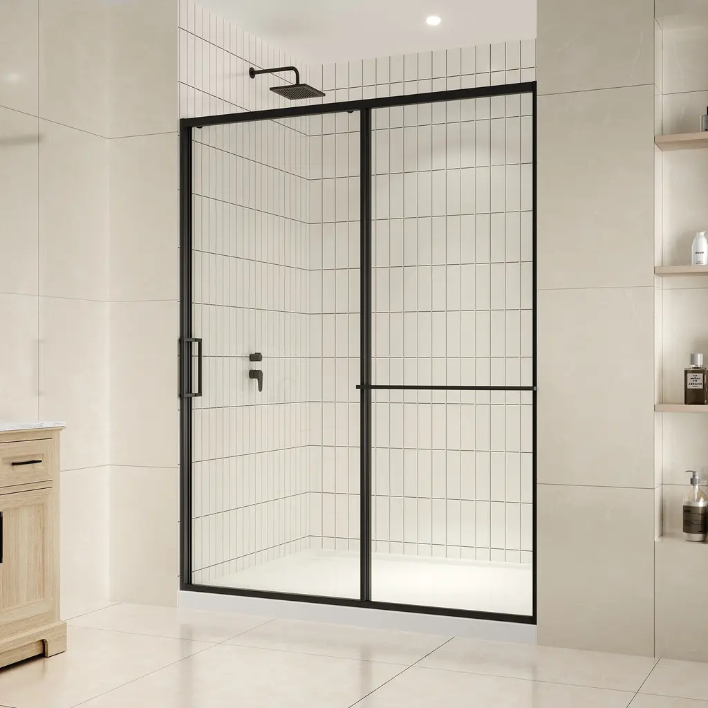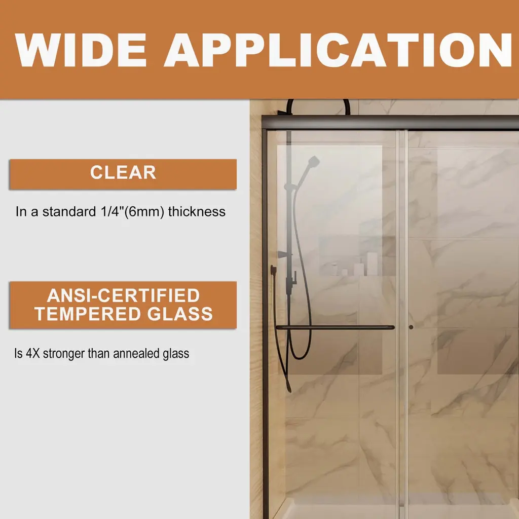 【Product Features】 ★54 in. x 72 in. Traditional Sliding Shower Door in Matte black with Clear Glass ★Vertical Uneven (Out-of-plumb) Tolerance: 1/4" ★Door Opening Size: 21-1/2 to 25-1/2'' ★Glass: 1/4'' (6mm) ANSI Certified Tempered Glass ★Handle Material: 304 Stainless Steel ★Side & Bottom Tracks Material: Anodized Aluminium ★Packaging: All in 1 Carton (Including Installation Instructions) 【Description】 [50-54" W x 72" H Semi-Frameless Sliding Shower Door] Shower door mainly consists of 2-sliding panels that could slide from either direction Barn-door style rollers crafted from Anodized Aluminium provide a smooth, luxurious glide Minimum of 72 In. height clearance is recommended for successful installation Slim aluminium bottom track is designed to reduce water leakage Clear door glass panels are almost fully transparent to provide the broad vision Nano Coating to dramatically resist water spots, soap scum and shatter-retention film to give extra protect from accidental explosion Detailed, step-by-step instructions and assembly hardware are included for easy installation within 1 package ONLY Measurements for installation shall be done after the walls are fully completed 【This product is fragile, if there is any damage when you receive the goods, please take a photo and contact us, so that we can quickly verify and deal with you】 【Notes】 1.Size Notice:Manual measurement has been used, there may be some reasonable errort, thanks for your understanding. 2.Color Notice:Due to factors such as display equipment and shooting environment, the color of the item may be slightly different from the picture, which is a normal phenomenon, please refer to the actual item 3.Assembly Notice:Please read assemble manual in advance. Please do not over-tighten nuts, as this may cause distortion or breakage. 4.It is recommended to put a layer of foam or soft cushion on the floor when installing to avoid scratching the floor. 5.If the item has any defects, damage or missing parts, please contact us with pictures or videos so that we can understand your needs and help you quickly, and always remember to retain its original packaging to ensure any return requests. We will try our best to solve any problems you may have. 6.If you receive the wrong product, please attach the product picture, the infographic of the outer package and the picture containing SKUs, so that we can verify and quickly deal with it for you