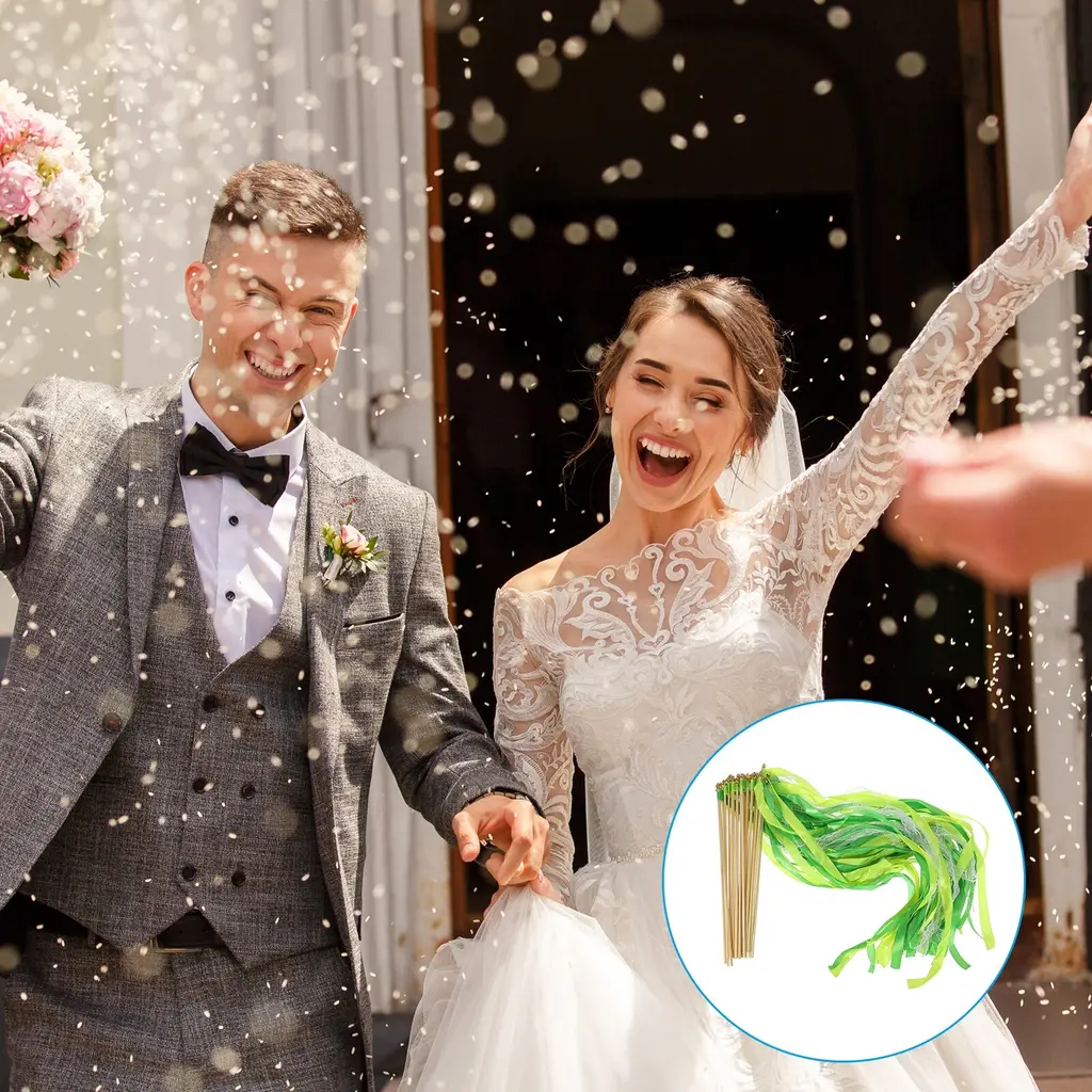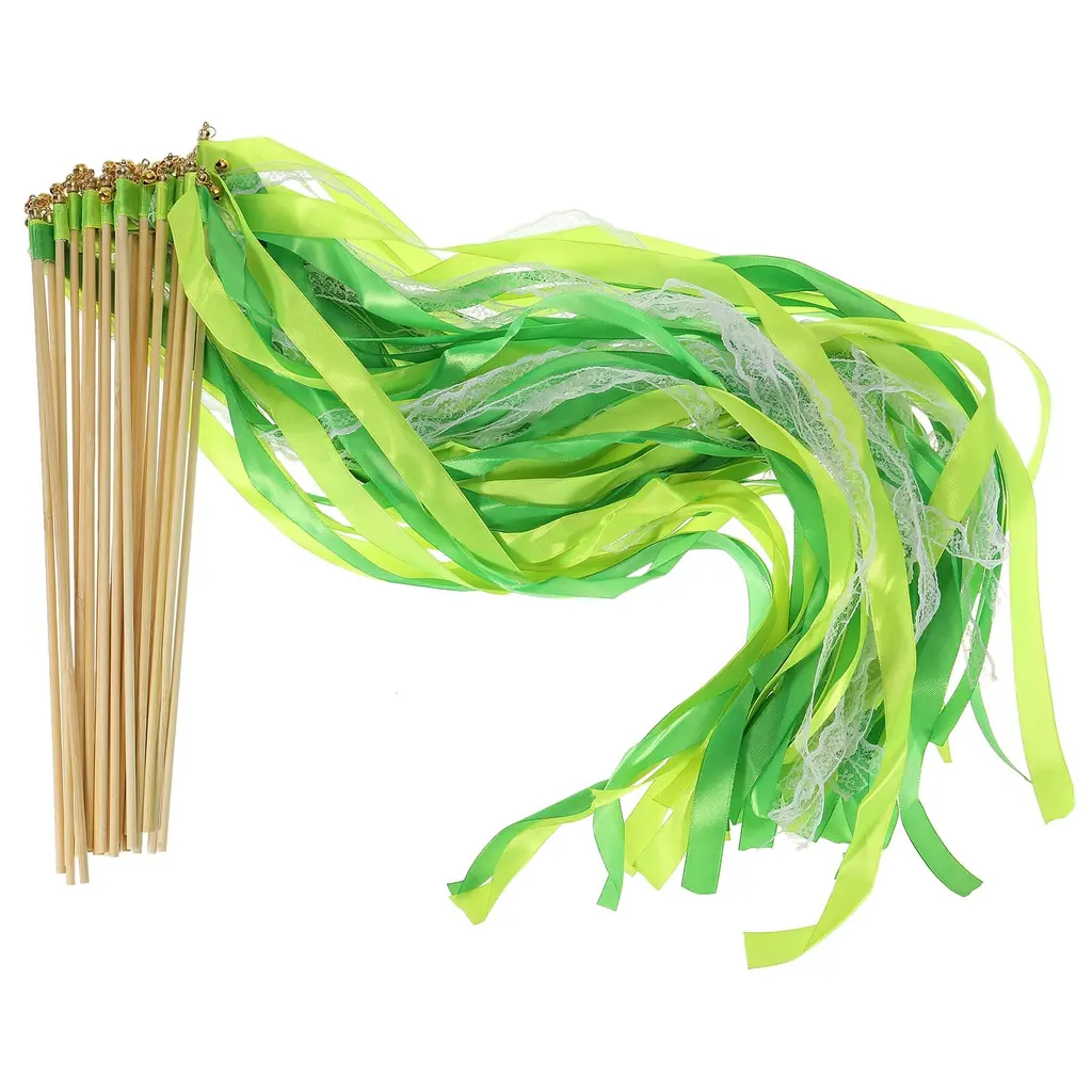 The beautiful and romantic fairy wands can add a magical touch to weddings, bridal showers, send off, birthdays, party favors, other special events; Also a fun accessory for costumes, dress-up play, or cheerful holiday celebrations.Specification Color: Green/Light GreenMaterial: Silk Ribbon, Lace, WoodRibbon Length: 60cm / 23.6 inchStick Length: 30cm / 11.8 inchPacking List: 50Pcs x Decorative Ribbon Fairy WandsAdvantageThe fairy stick wand is made of lightweight satin ribbon and lace, with a wooden wand handle is comfortable to hold and wave around. The colorful ribbons create an enchanting and playful appearance.InstructionHold the wand by the handle, ensuring a secure grip. Wave the wand gently in the air to create flowing movements with the ribbons.NOTE: Keep them away from open flame or heat sources to prevent damage. Ensure that the ribbons are securely attached to the wand to avoid potential harm.