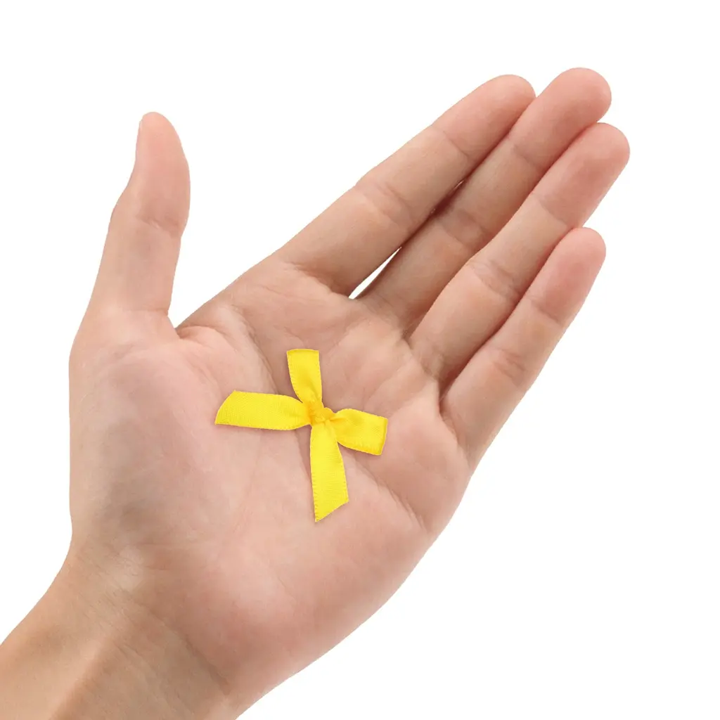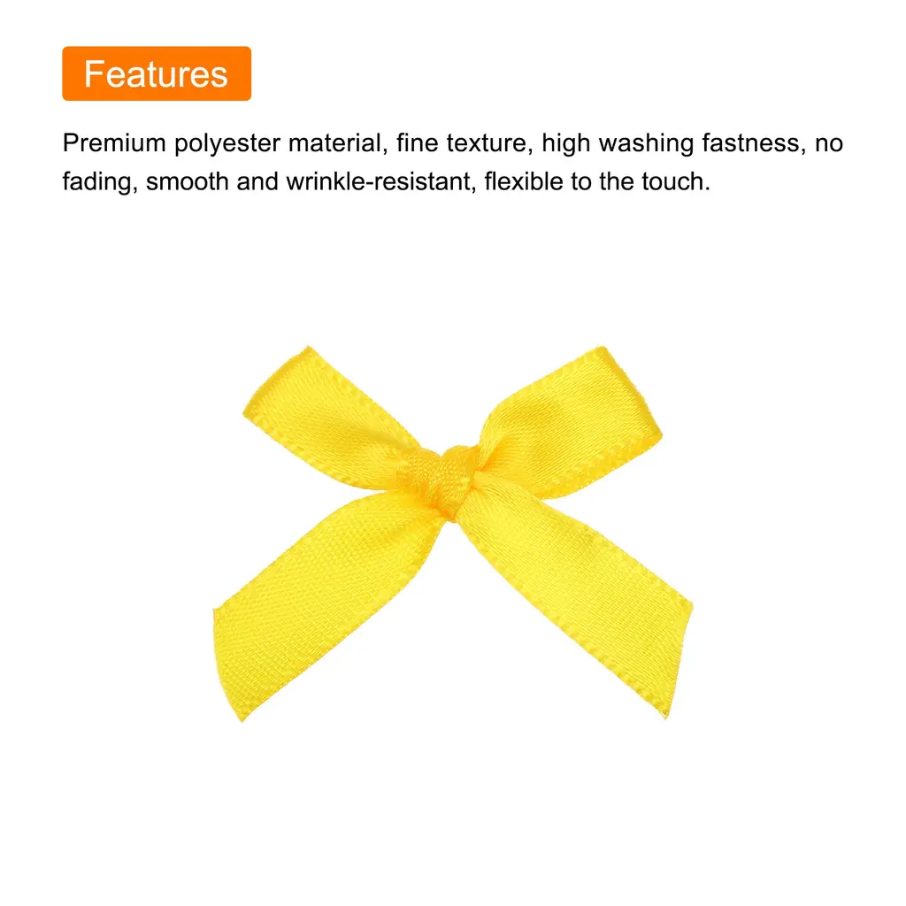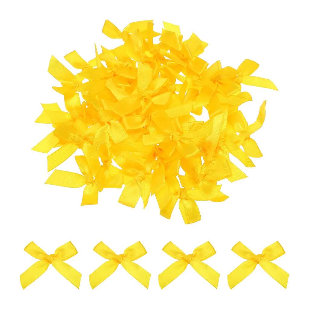 What is this?These ribbon bows are mostly used in the hemming and decoration of leather goods, bags, sleeping bags, tents, and clothing. Because polyester ribbon is soft, they are mostly used for the hemming of softer fabrics.What will I get?The Mini Ribbon Bow, we provide here, is in size of:Material: PolyesterColor: Bright YellowDimension: 1.8 x 1.6 inchIn the package of: 50 x Mini Ribbon BowsAre there any advantages of the product?1. Premium polyester material, fine texture, high washing fastness, no fading, smooth and wrinkle-resistant, flexible to the touch.2. The product is bright in color, fashionable and new in design, and can be used on many occasions. It is suitable for hair accessories, clothing, Christmas gifts, baking decorations, gift box packaging, hotel decorations, wedding decorations, flower packaging, birthday arrangements, etc.How to use it?1. Choose the color of the Mini Ribbon Bow that matches your project or gift wrapping paper. 2. Use twist ties (not included here) or or glue to secure the mini ribbon bows to desired surfaces such as gift boxes, cards, or crafts. 3. Adjust the position of the bow if necessary to get the desired look.What should I notice?Manual measurement, please allow slight errors in size.Please note that there may be a slight color difference between the picture and the actual product, and the color is subject to the actual product received.