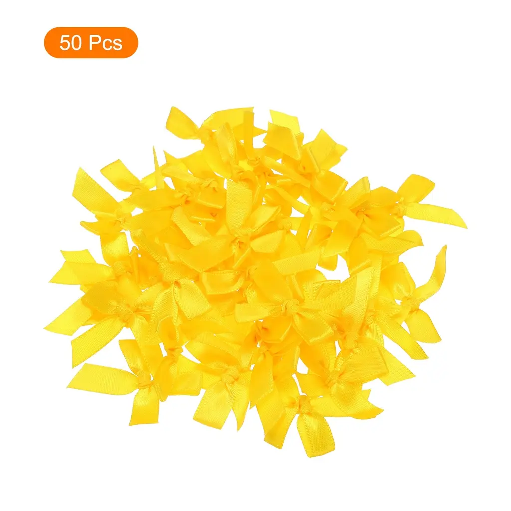 What is this?These ribbon bows are mostly used in the hemming and decoration of leather goods, bags, sleeping bags, tents, and clothing. Because polyester ribbon is soft, they are mostly used for the hemming of softer fabrics.What will I get?The Mini Ribbon Bow, we provide here, is in size of:Material: PolyesterColor: Bright YellowDimension: 1.8 x 1.6 inchIn the package of: 50 x Mini Ribbon BowsAre there any advantages of the product?1. Premium polyester material, fine texture, high washing fastness, no fading, smooth and wrinkle-resistant, flexible to the touch.2. The product is bright in color, fashionable and new in design, and can be used on many occasions. It is suitable for hair accessories, clothing, Christmas gifts, baking decorations, gift box packaging, hotel decorations, wedding decorations, flower packaging, birthday arrangements, etc.How to use it?1. Choose the color of the Mini Ribbon Bow that matches your project or gift wrapping paper. 2. Use twist ties (not included here) or or glue to secure the mini ribbon bows to desired surfaces such as gift boxes, cards, or crafts. 3. Adjust the position of the bow if necessary to get the desired look.What should I notice?Manual measurement, please allow slight errors in size.Please note that there may be a slight color difference between the picture and the actual product, and the color is subject to the actual product received.