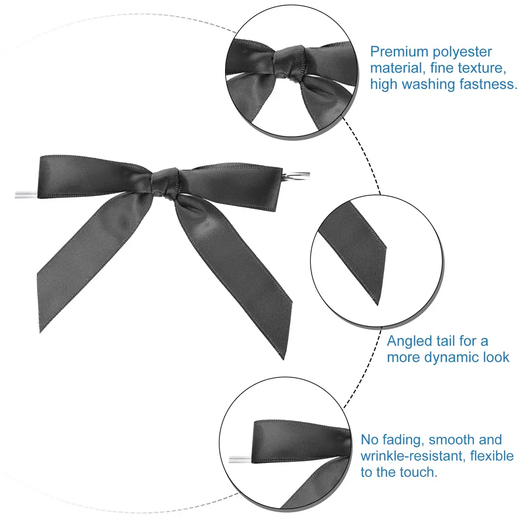 What is this?These ribbon bows are mostly used in the hemming and decoration of leather goods, bags, sleeping bags, tents, and clothing. Because polyester ribbons are soft, they are mostly used for the hemming of softer fabrics.What will I get?The Mini Ribbon Bow, we provide here, is in size of:Material: PolyesterColor: BlackDimension: 3.5 x 3.5 inchIn the package of: 50 x Mini Ribbon BowsAre there any advantages of the product?1. Premium polyester material, fine texture, high washing fastness, no fading, smooth and wrinkle-resistant, flexible to the touch.2. The product is bright in color, fashionable and new in design, and can be used on many occasions. It is suitable for hair accessories, clothing, Christmas gifts, baking decorations, gift box packaging, hotel decorations, wedding decorations, flower packaging, birthday arrangements, etc.How to use it?1. Choose the color of the Mini Ribbon Bow that matches your project or gift wrapping paper. 2. Use the transparent twist tie to attach the Mini Ribbon Bow to the desired surface, such as a gift box, card, or craft project. 3. Adjust the position of the bow if necessary to get the desired look.What should I notice?Manual measurement, please allow slight errors in size.Please note that there may be a slight color difference between the picture and the actual product, and the color is subject to the actual product received.