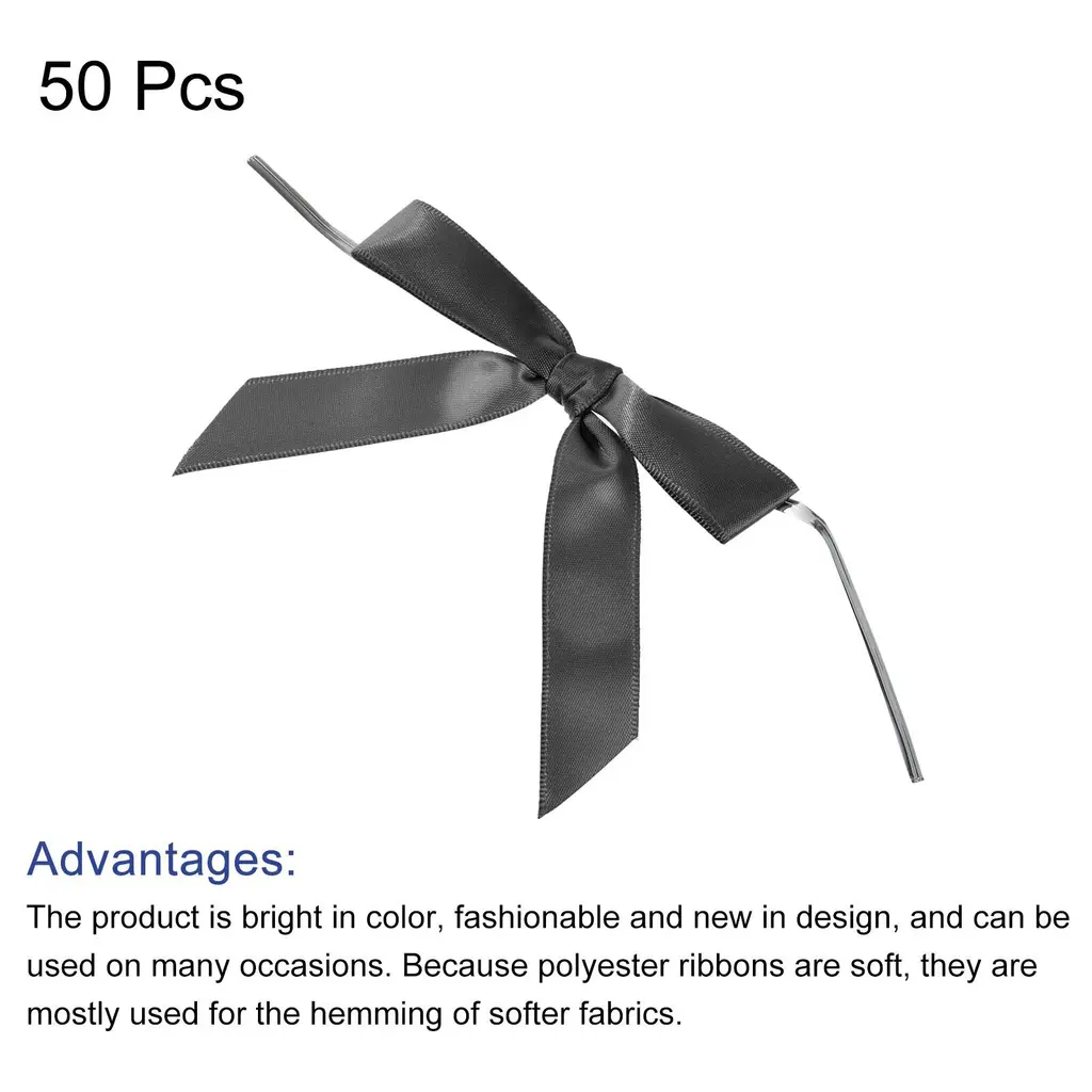 What is this?These ribbon bows are mostly used in the hemming and decoration of leather goods, bags, sleeping bags, tents, and clothing. Because polyester ribbons are soft, they are mostly used for the hemming of softer fabrics.What will I get?The Mini Ribbon Bow, we provide here, is in size of:Material: PolyesterColor: BlackDimension: 3.5 x 3.5 inchIn the package of: 50 x Mini Ribbon BowsAre there any advantages of the product?1. Premium polyester material, fine texture, high washing fastness, no fading, smooth and wrinkle-resistant, flexible to the touch.2. The product is bright in color, fashionable and new in design, and can be used on many occasions. It is suitable for hair accessories, clothing, Christmas gifts, baking decorations, gift box packaging, hotel decorations, wedding decorations, flower packaging, birthday arrangements, etc.How to use it?1. Choose the color of the Mini Ribbon Bow that matches your project or gift wrapping paper. 2. Use the transparent twist tie to attach the Mini Ribbon Bow to the desired surface, such as a gift box, card, or craft project. 3. Adjust the position of the bow if necessary to get the desired look.What should I notice?Manual measurement, please allow slight errors in size.Please note that there may be a slight color difference between the picture and the actual product, and the color is subject to the actual product received.