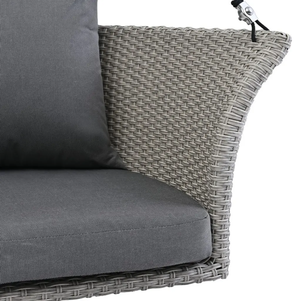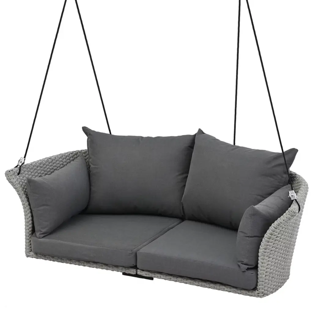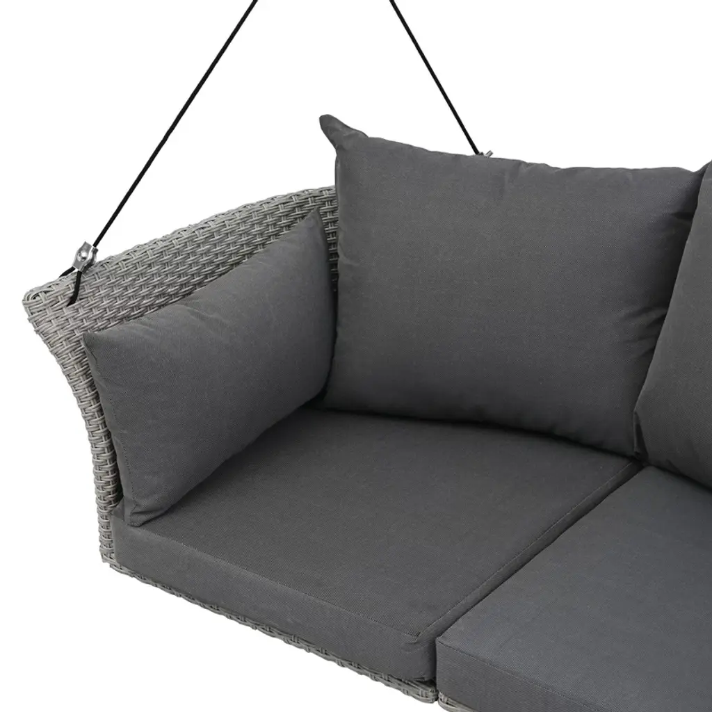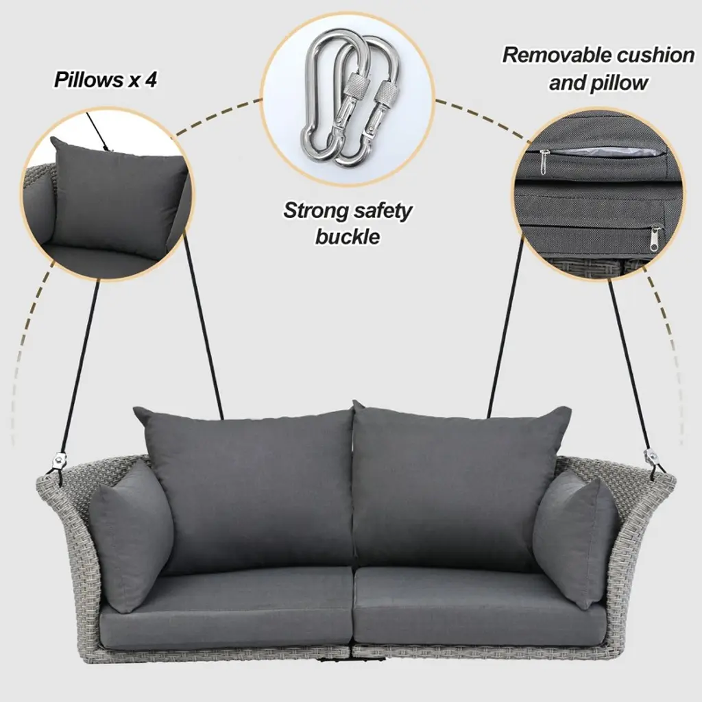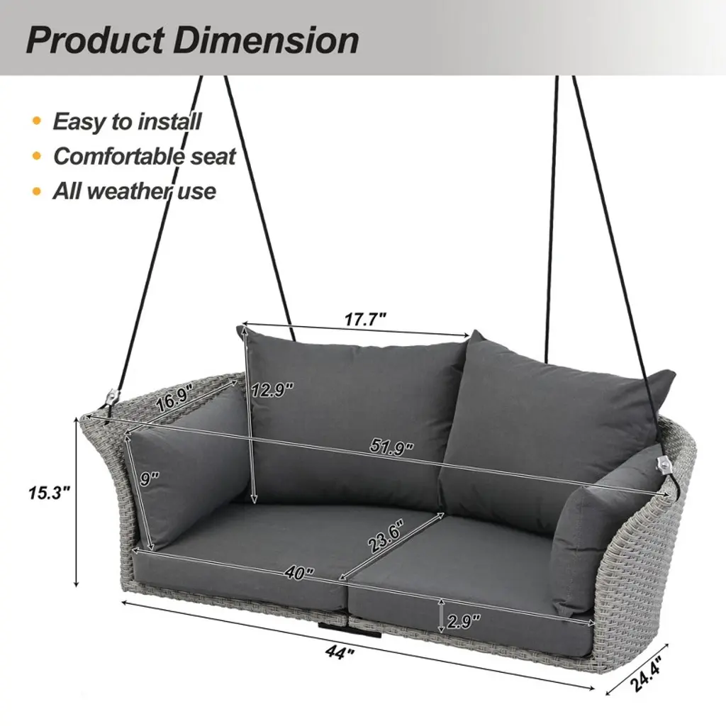 Unwind in style with our All-Weather Woven Swing Chair—designed for comfort, built for durability, and made to withstand the elements. Whether you're relaxing solo or snuggling with a loved one, this beautifully crafted outdoor swing offers the perfect blend of support, luxury, and resilience. From sunny patios to cozy porches, it's the ultimate addition to any outdoor retreat. Product Features All-Weather Use: Made with premium black woven material that's waterproof and sun-resistant—perfect for year-round outdoor use.Extra Comfort: Includes a thick seat cushion and plush pillow to support your back and neck for ultimate relaxation.Sturdy Hardware: Reinforced with high-strength ropes and hardware, this swing safely supports up to 500 lbs (250 lbs per seat).Adjustable Rope: Comes with two 3.4-meter-long ropes and turnbuckles so you can easily adjust the swing's height to your preference.Easy to Install: Quick and simple setup—everything you need is included. Assembles in just 10 minutes. About This Item Material: Durable black woven all-weather fabricCushions: Removable thick seat cushion and plush pillows includedDesign: Sleek curved handrails for comfort and safetyRope Length: Two 3.4-meter ropes with turnbuckles for height adjustmentWeight Capacity: 500 lbs total (250 lbs per seat)Assembly: Adult assembly required; all tools includedAssembly Time: Approx. 10 minutesIdeal For: Patios, balconies, gardens, and porches