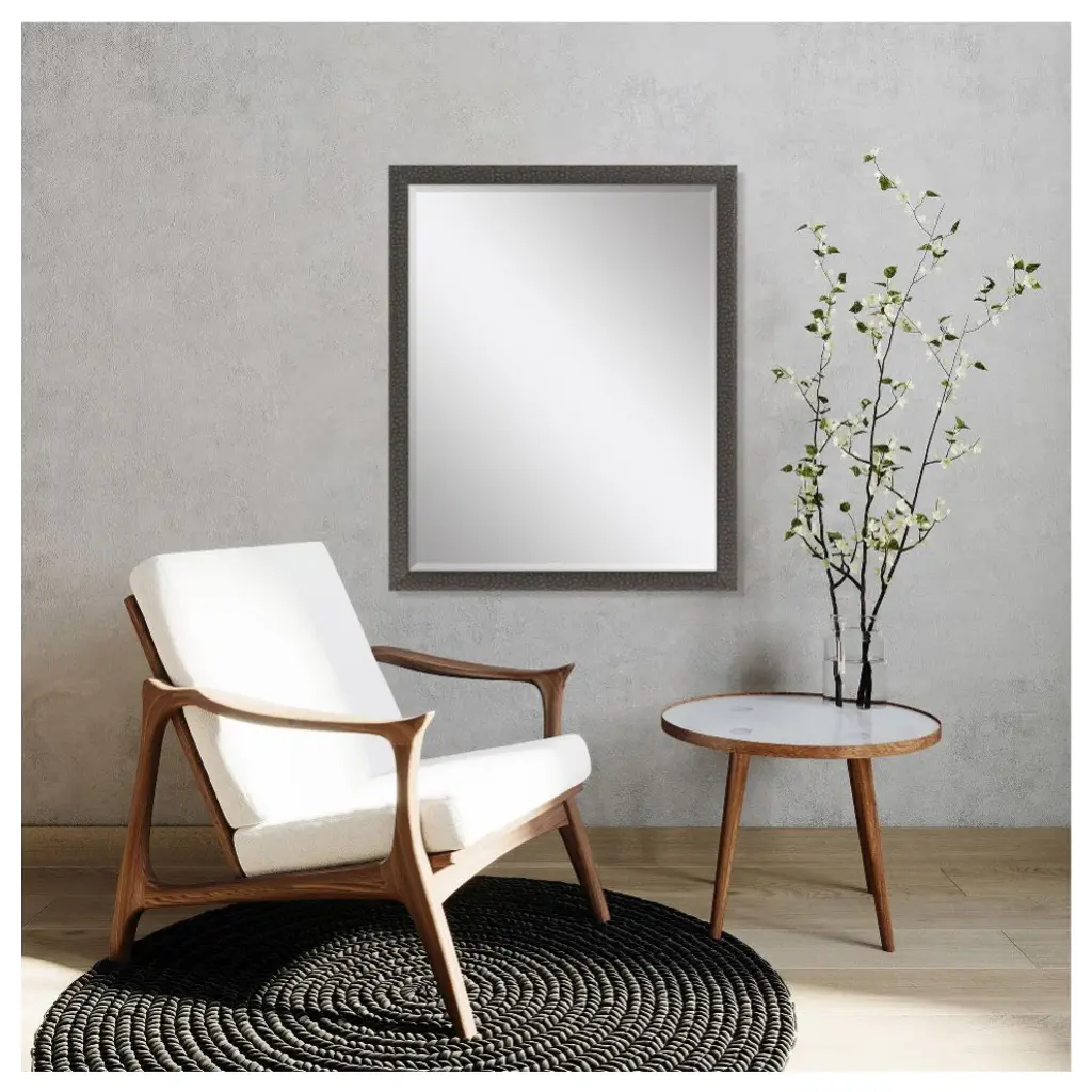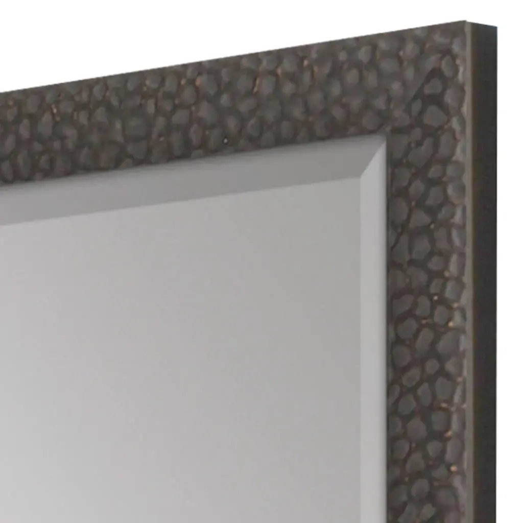 Elegant beveled mirror is framed in a modern rubbed matte black wood with honeycomb embossing.