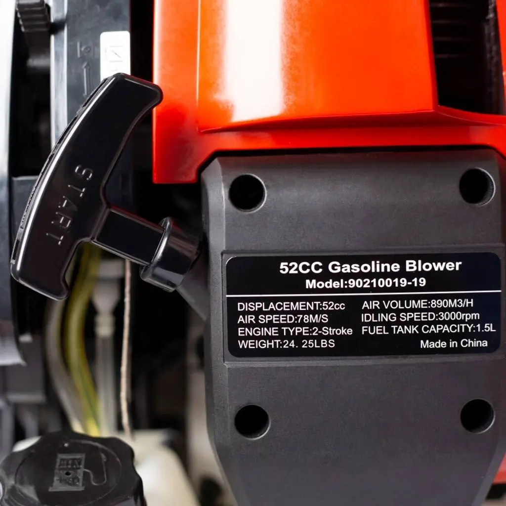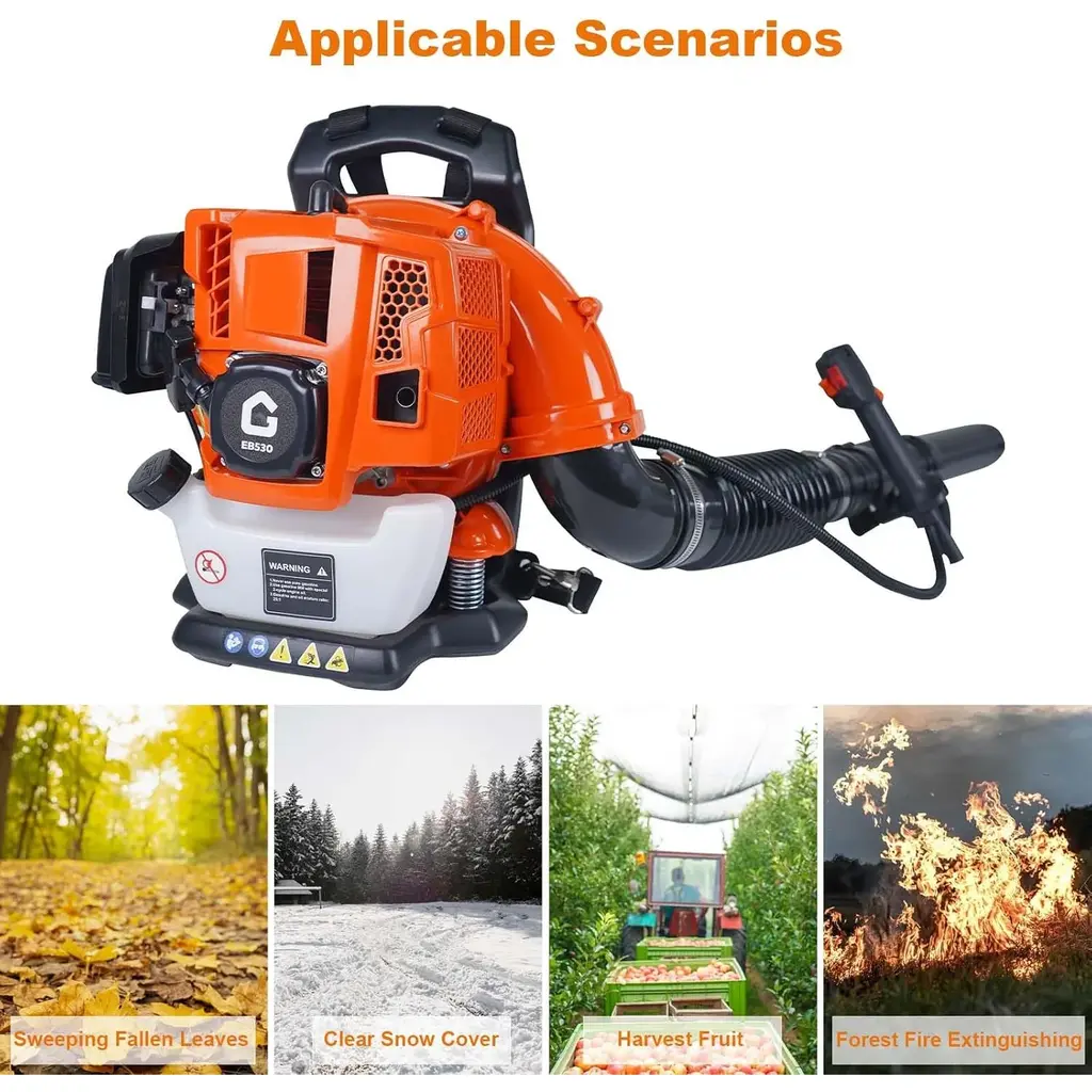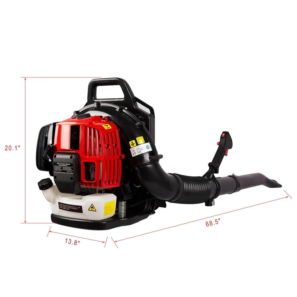 Multifunctional Gas Blower: The backpack blower is easy to start, once started, gas powered leaf blower will create a whirlwind to help gather the fallen leaves. It delivers a fan speed of up to 7500 rpm. The robust and powerful gas blower is ideal for cleaning large areas, grass, beds, leaves, paper, etc.Powerful Gas Leaf Blower: This leaf blower has a powerful 2-stroke 52cc engine, gas leaf blower features high speed air flow, it delivers 530 CFM air volume, and the air speed is 248 MPH, more high and stable performance than its competitors.Easy to Use: Heavy duty frame, extremely lightweight, Ergonomic adjustable shoulder straps provide extra comfort. Highly integrated handle, very user friendly.Speed Adjustable Blower: Our gas blower with variable speed throttle and tube cruise controller, you can accurately blow wherever you want and adjust the speed at your needs. This gas blower maximizes the routime and mobility, easy to carry, the weight is 21lbs.Large Tank: The powerful and economical engine is equipped with a large tank. This leaf blower guarantees a comfortable long and efficient work.Shipping and Service: We will ship your item immediately and the Fedex/UPS will deliver the item to you within 5-8 business days.Product Information: Main Material: Steel; PlasticCylinder Capacity: 52CCEngine type: Air-cooled, two-stroke, single-cylinderEngine power: 1.45 kWMax speed: 7500 revolutions per minuteMax air volume: 600 CFMAirSpeed: 150 MPHNoise: 111 dBNet weight: 21 LBSFuel tank Capacity: 1.4LHeavy duty frame, Adjustable shoulder strapsPackage Include:1x Gasoline Backpack Leaf Blower1x Tool kit1x Manual