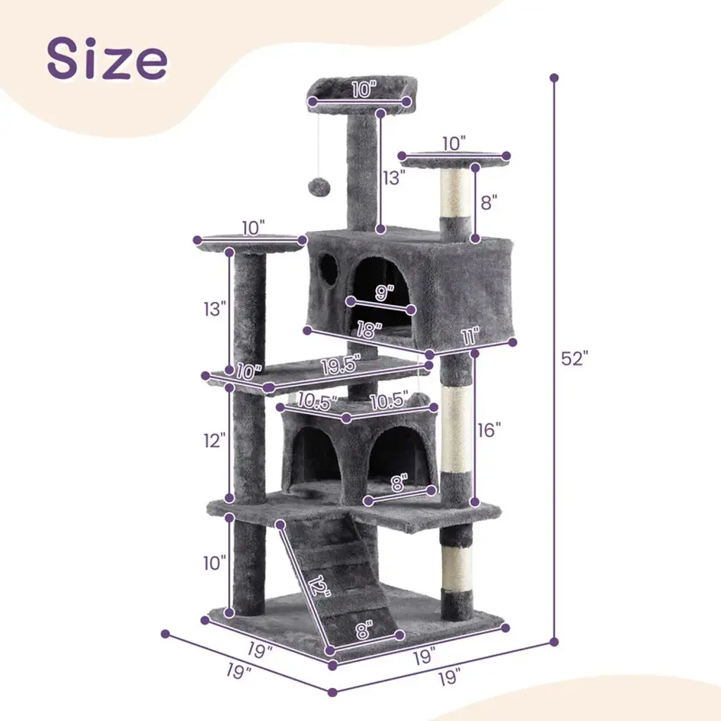 Introductions: Provide your feline friends with endless fun and comfort with our 53 inch Multi-Level Cat Tree Cat Condo. Designed to cater to all your cat's needs, this activity tower features multiple levels for climbing, cozy condos for resting, and scratching posts for keeping claws healthy. The dark grey color and stylish design make it a perfect addition to any home decor. Crafted from durable MDF, plush fabric, and sisal rope, this cat tree offers a sturdy and comfortable play space for your pets.Features: 1. Ultimate Cat Play Center: This large multi-level cat tree offers endless fun with areas for scratching, climbing, sleeping, and exercising. Your cats will love the well-padded perches, large cozy condos, interactive toy balls, and a plush ramp on the base, making it their favorite activity hub. 2. Perfect Scratching Solution: Keep your cats happy and your furniture safe with sisal-wrapped scratching posts. They are perfect for satisfying your cats' natural claw-sharpening instincts, providing a dedicated space for them to scratch. 3. Sturdy and Secure: Built with high-quality MDF board, this cat tower is designed for maximum stability. The reinforced base and anti-toppling fittings ensure a secure and safe environment for your cats to play and rest. 4. Comfortable and Cozy: Featuring two spacious condo and three padded platforms, this cat tree provides luxurious napping spots. The plush fabric covering adds extra comfort, creating a perfect retreat for your feline friends. 5. Easy to Assemble: This cat tree comes with straightforward assembly instructions, allowing you to set it up quickly and effortlessly. With a low-profile dark grey color, this cat tree complements any home decor.Specifications: 1. Overall Dimensions: (19 x 19 x 53) in / (48.3 x 48.3 x 134.6) cm 2. Large Condo: 18 x 11 in / 45.7 x 27.9 cm 3. Small Condo: 10.5 x 10.5 in / 26.7 x 26.7 cm 4. Round Platforms Diameter: 10 in / 25.4 cm 5. Material: MDF, Plush Fabric, Sisal RopePackage Includes: 1 x 53 inch Cat Tree Cat Condo