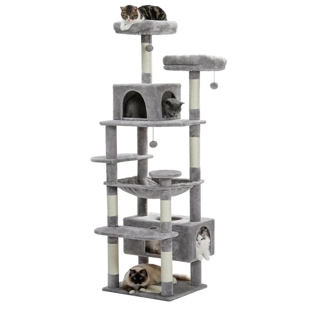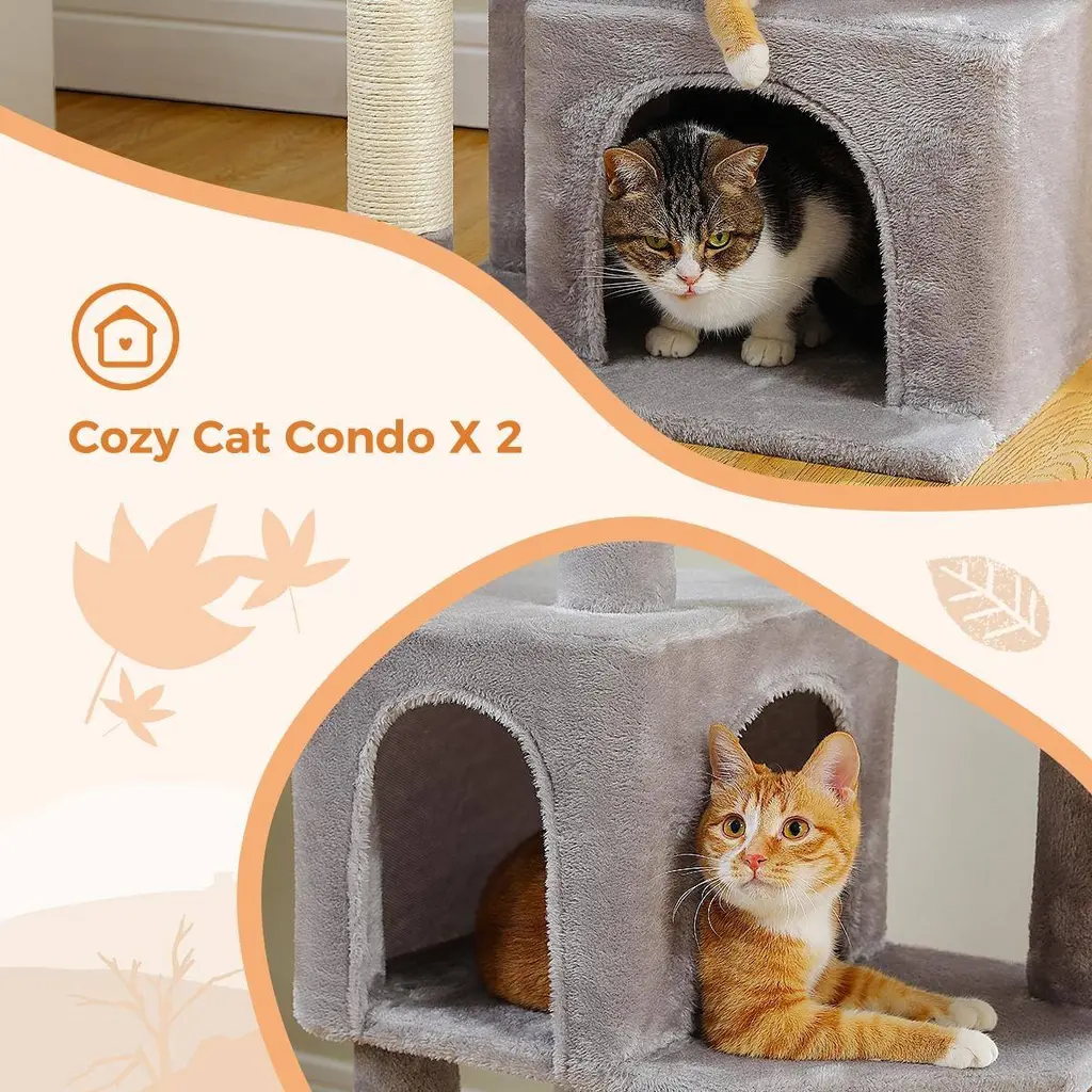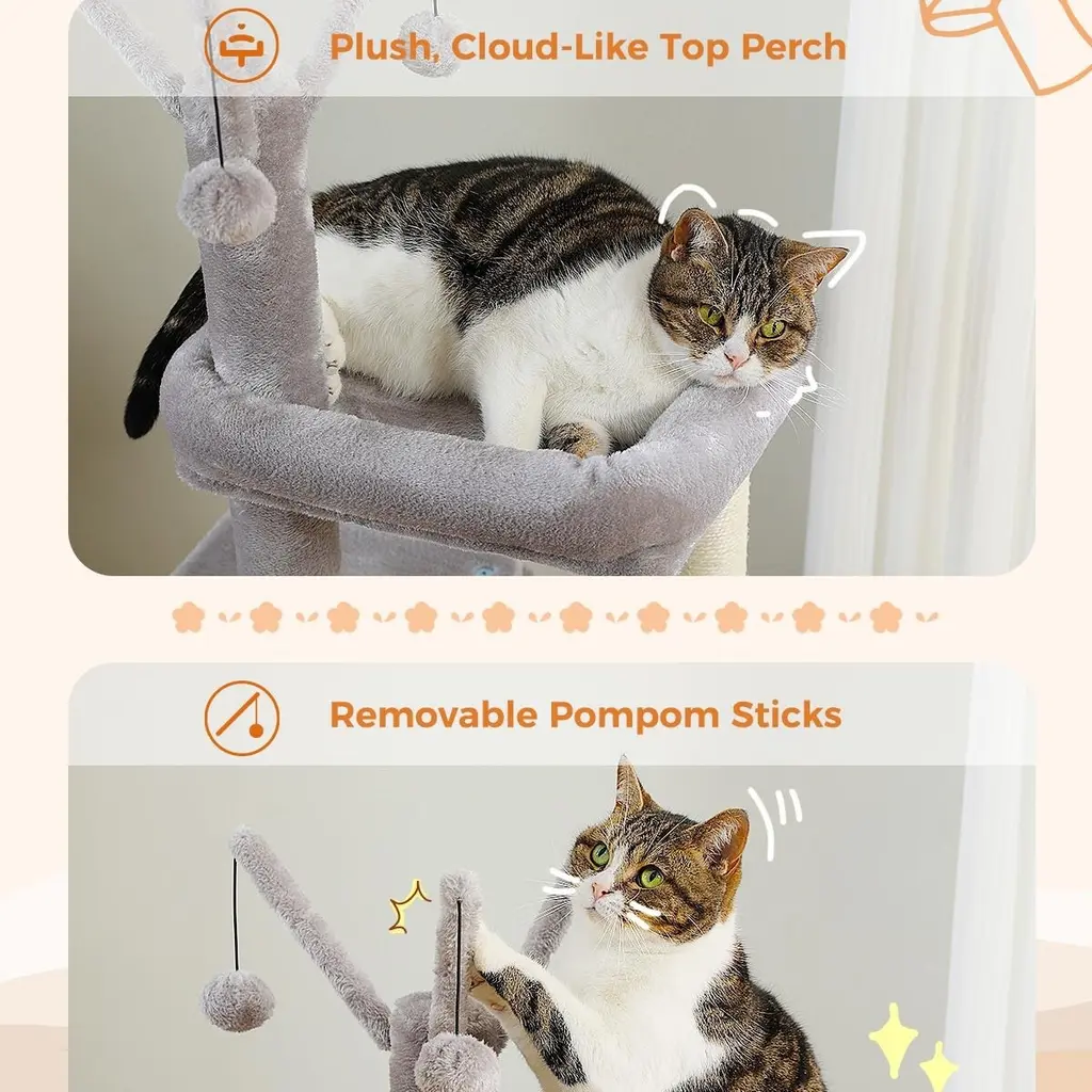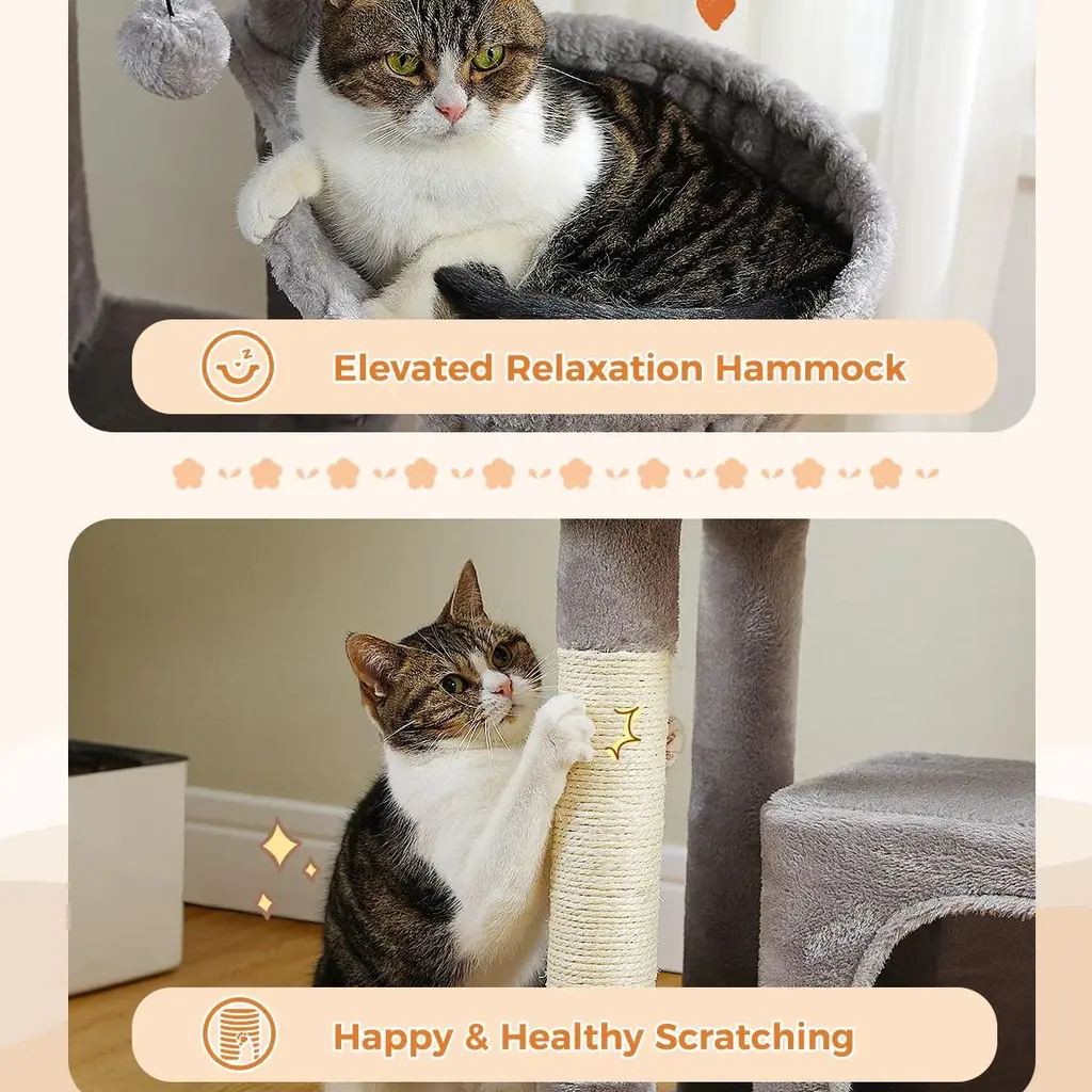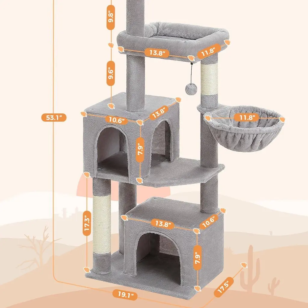 Crafted with meticulous attention to detail, the 53-Inch High Cat Tree combines functionality and elegance. Its sturdy construction, made of premium chipboard, ensures durability and stability, while the plush coverings on each level provide a cozy and inviting space for your cats to relax and play. Multiple Levels and Apartments: With two spacious cat apartments nestled within the cat tree, your feline friends will have their own private havens to retreat to whenever they desire. These snug apartments offer a sense of security, providing a quiet sanctuary for your cats to observe their surroundings or indulge in a peaceful nap. Hammock and Detachable Plush Ball Toys: Catering to your cats' love for lounging, the 53-Inch High Cat Tree comes equipped with a luxurious hammock, providing the perfect spot for leisurely lounging and sunbathing. Additionally, three detachable plush ball toys are included, which will surely captivate your cats' attention and ignite their natural instinct to play. Satisfy Their Scratching Needs: We understand that scratching is an essential part of every cat's life. That's why our cat tree features multiple scratching posts covered in durable sisal rope. These posts will help redirect your cats' scratching behavior away from your furniture and onto a designated and cat-approved area. Promote Exercise and Exploration: With its multi-level design, the 53-Inch High Cat Tree offers ample opportunities for your cats to climb, jump, and explore. This promotes physical activity, which is crucial for their overall well-being. Watch with delight as they effortlessly navigate the tree, exercising their muscles and satisfying their natural curiosity. At our company, we prioritize the satisfaction and safety of both you and your cats. The 53-Inch High Cat Tree undergoes rigorous quality control measures to ensure that it meets the highest standards. Rest assured, our product is designed to provide years of enjoyment and companionship for your furry friends.
