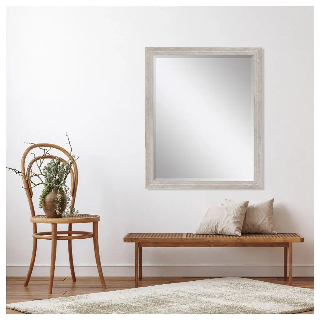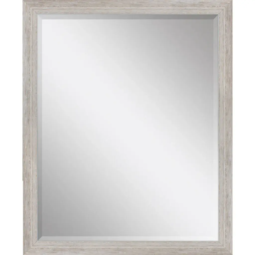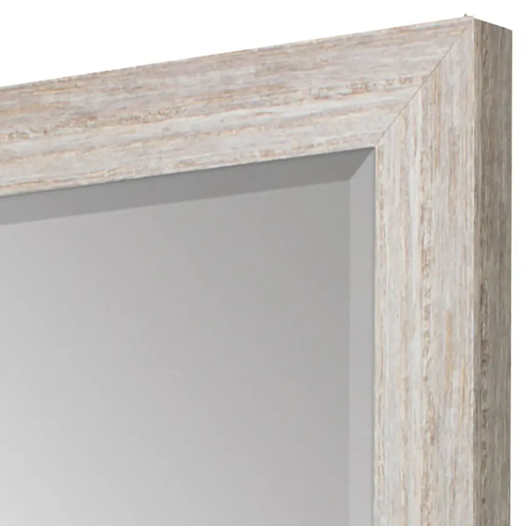 Elegant beveled mirror is framed in a distressed whitewash finish moulding.