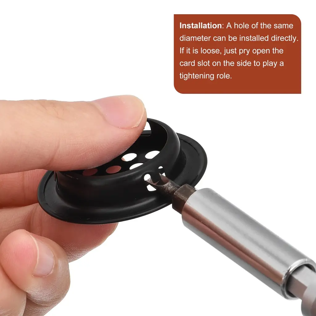 Description:1. Material: The round air vent is made of stainless steel, rust and corrosion-resistant, durable, and strong ability to withstand gravity, not only anti-oxidation but also a more beautiful installation effect.2. Design: The exhaust hole is designed with round mesh. The 3mm small round hole can be dust-proof and not easily blocked.3. Installation: A hole of the same diameter can be installed directly. If it is loose, just pry open the card slot on the side to play a tightening role.4. Application: A circular soffit vent is suitable for cabinets, shoe cabinets, wardrobes, TV cabinets, drawers, etc., and is widely used in offices, bathrooms, kitchens and other furniture needed to exhaust the occasion.Specification:Color: BlackMaterial: Stainless SteelOutside Diameter: 65mm / 2.56"Bottom Diameter: 53mm / 2.09"Mounting Height: 9mm / 0.35"Package Content: 20pcs x Circular Soffit Vents