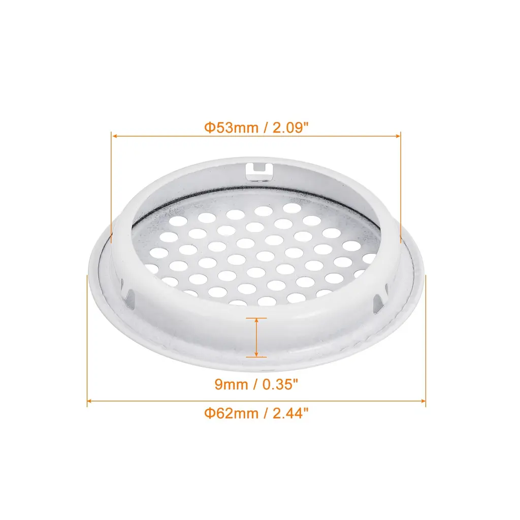 Description:1. Material: The round air vent is made of stainless steel, rust and corrosion-resistant, durable, and strong ability to withstand gravity, not only anti-oxidation but also a more beautiful installation effect.2. Design: The exhaust hole is designed with round mesh. The 3mm small round hole can be dust-proof and not easily blocked.3. Installation: A hole of the same diameter can be installed directly. If it is loose, just pry open the card slot on the side to play a tightening role.4. Application: A circular soffit vent is suitable for cabinets, shoe cabinets, wardrobes, TV cabinets, drawers, etc., and is widely used in offices, bathrooms, kitchens and other furniture needed to exhaust the occasion.Specification:Color: WhiteMaterial: Stainless SteelOutside Diameter: 62mm / 2.44"Bottom Diameter: 53mm / 2.09"Mounting Height: 9mm / 0.35"Package Content: 30pcs x Circular Soffit Vents
