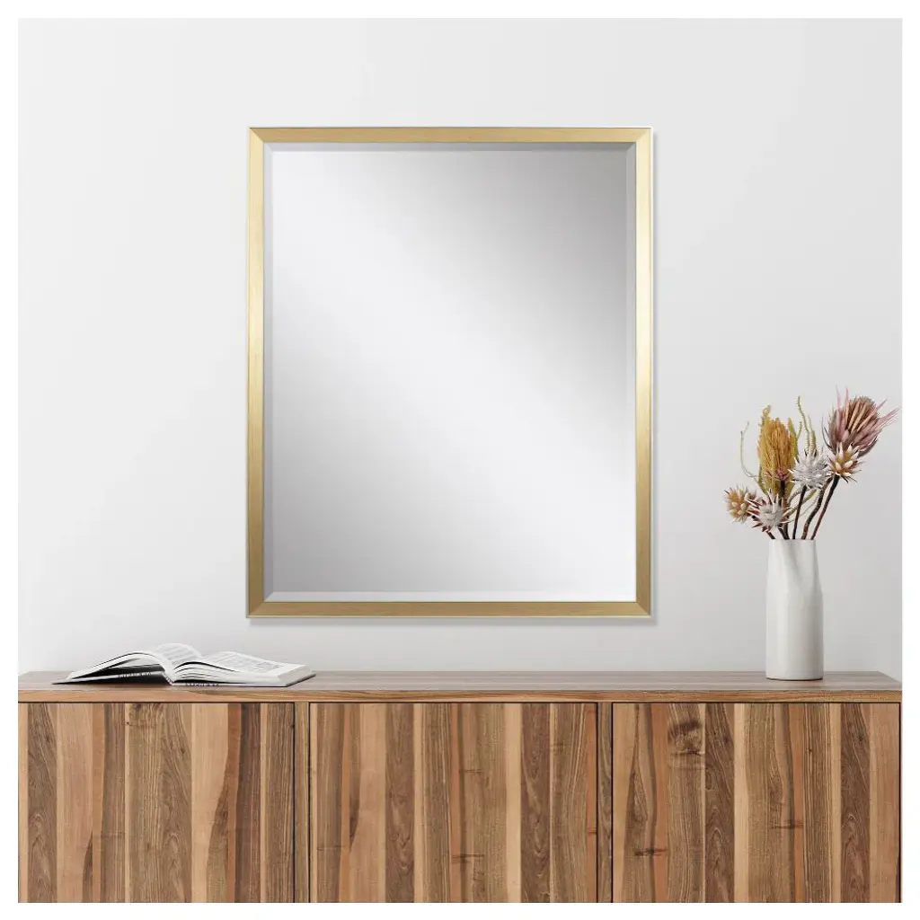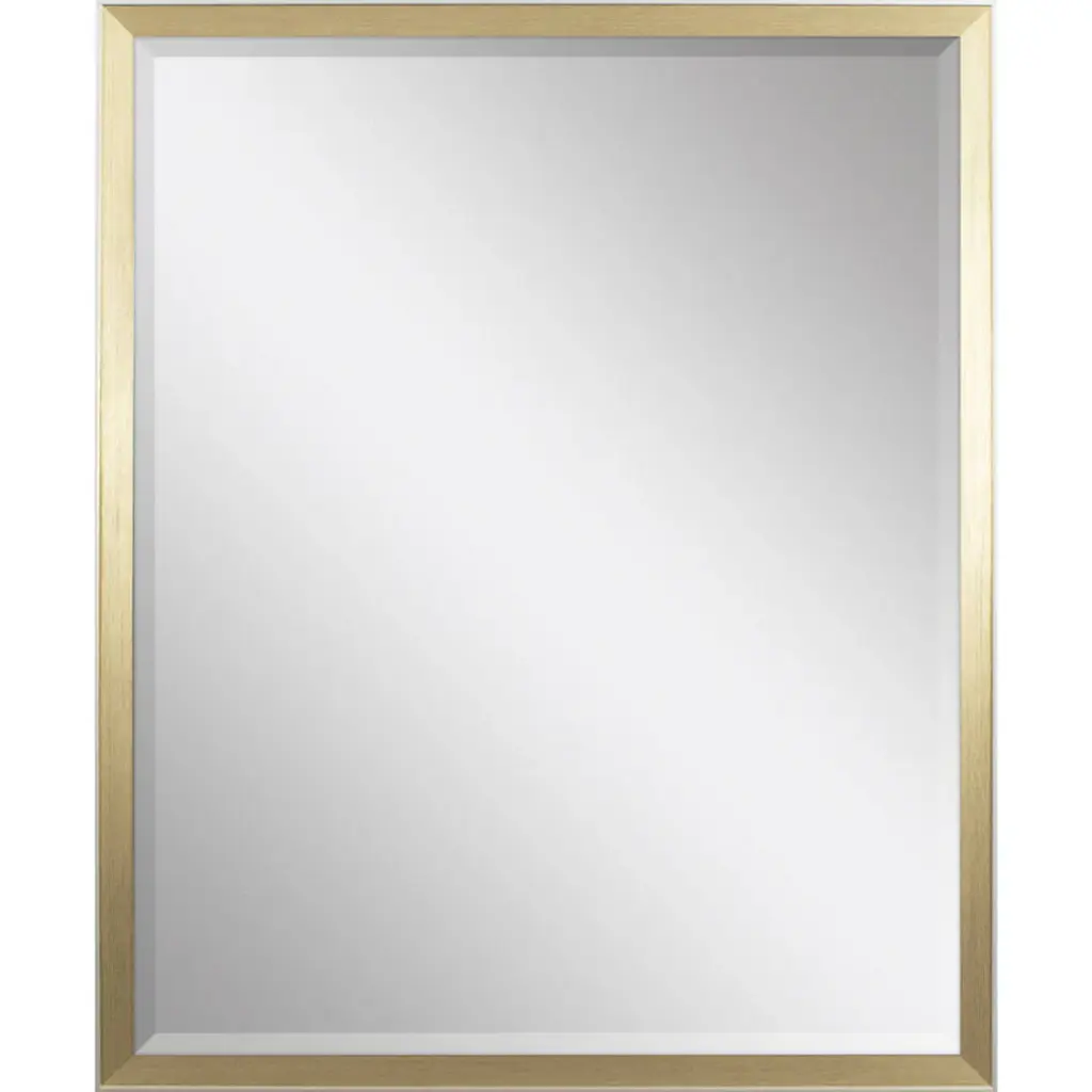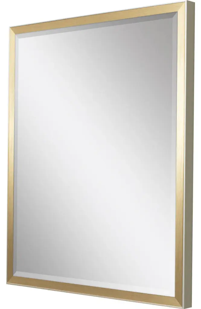 Elegant beveled mirror is framed in a modern gold finish moulding with a champagne gold side and lip.