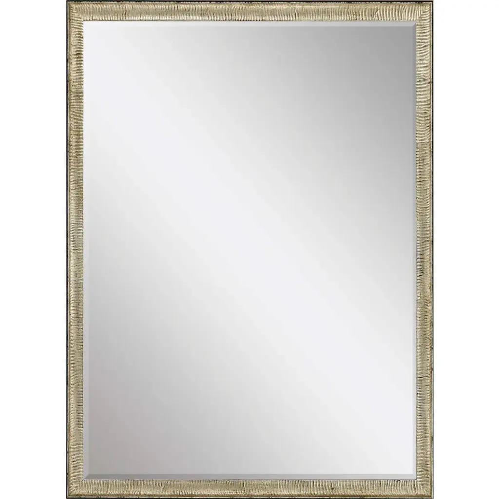 Elegant beveled mirror is framed in an antique silver leaf sloped wood with embossed face and black painted side.