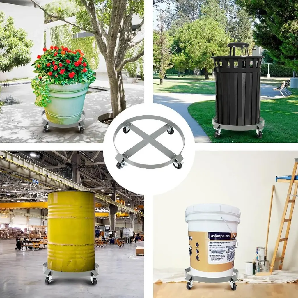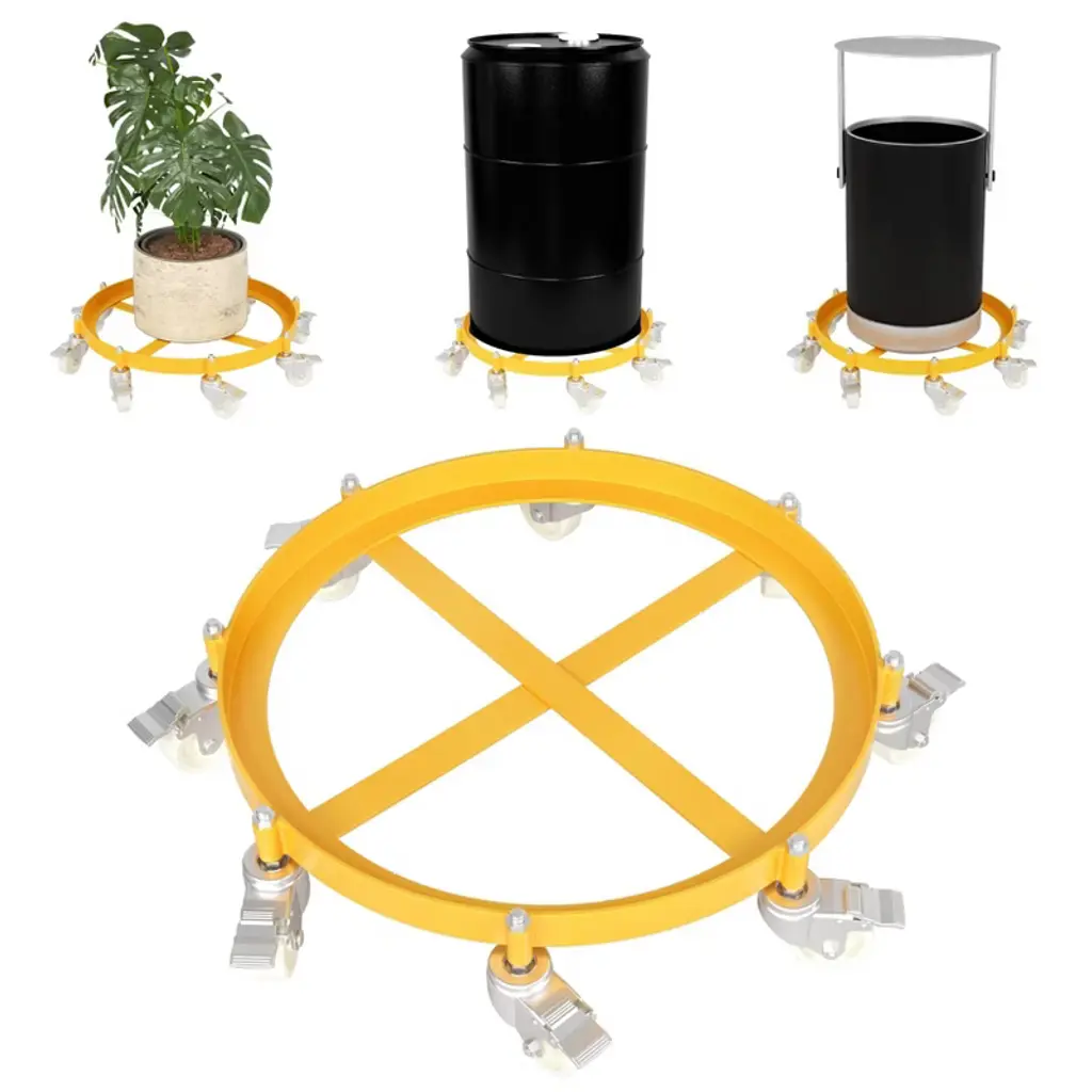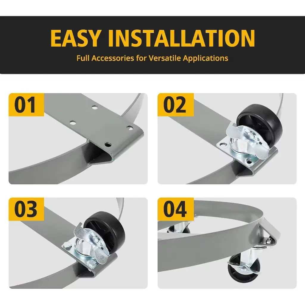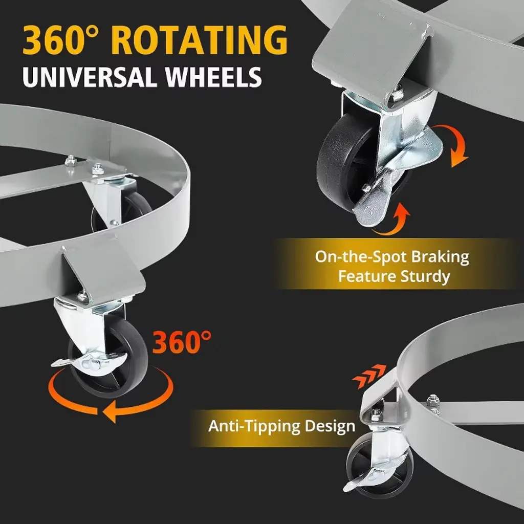 This heavy-duty 55 gallon drum dolly is engineered to provide a secure and reliable solution for handling and transporting drums in warehouses, workshops, and industrial environments. With an outer ring diameter of 26-3/8” and an inner diameter of 23-1/4”, it perfectly accommodates standard 55-gallon drums, ensuring a snug, stable fit that minimizes movement during transit. Crafted from premium carbon steel, the dolly features a thick 0.14-inch frame finished with a galvanized coating for exceptional durability, corrosion resistance, and protection against water damage. It can support drums weighing up to 1000 pounds, suitable for a broad range of heavy containers. The design incorporates cross braces that provide additional structural support, preventing warping, sagging, and tipping, which enhances the safety and stability of your load. Four swivel caster wheels make maneuverability effortless, allowing smooth and flexible movement in tight spaces without the need for brakes. The dolly is easy to assemble—simply align the wheel screws with the frame and tighten, completing the setup in under 10 minutes. Ideal for warehouse workers, facility managers, and anyone needing a sturdy, dependable dolly for drum handling, this product delivers performance and convenience for daily use. If you need a durable, stable, and easy-to-use drum dolly that can handle heavy loads and ensure safe transportation, this steel frame drum dolly is the perfect choice.