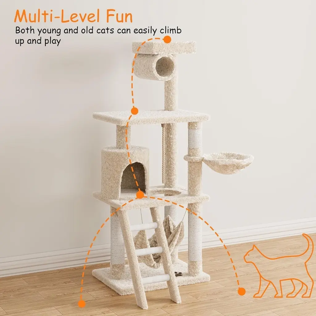 Perfect to Scratch: This big cat tree each scratching posts are lined with natural sisal ropes which is perfect to scratch and sharpen cats clawsSturdy and Secure: Supported by a strong structure and secured with an anti-tip kit, this cat tree is strong and safe for up to 5 cats (max. 30lb each) to climb and play with peace of mindMulti-Level to Relax: The heavy duty cat tree level structure is designed for more than one cat to play at the same time, for only one cat, it's an amusement parkWarm and Comfortable: Our cat condo is soft and warm lounging spots offer your cat a comfortable rest and sleepingRoom Design: The cat tree also can make your room rich and cute, not only for cats but also for room designEasy to Clean: Fur, dirt, and crumbs...no worries. Just a lint roller or vacuum cleaner can easily wipe them away