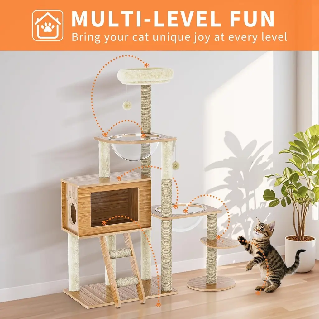 MULTI-PURPOSE ACTIVITY CENTER: Designed to meet the various needs of cats, this cat tower includes a perching platform, two spacious capsule dens, two hairballs, a litter box and a staircase. It's perfect for cats with different personalities to play, rest and explore. MODERN AND BEAUTIFUL: With its sleek and modern design and high-density wood construction, this cat tree not only provides endless climbing fun for cats, but also blends in perfectly with your home décor. It is a stylish and practical addition to any cat-loving family. NATURAL SCRATCHING AND CLIMBING: With multiple scratching zones and natural linen-wrapped pillars, this cat tree encourages your cat to scratch and climb, fulfilling their natural instincts while protecting your furniture from damage. STRONG & SAFE DESIGN: This 55-inch tall cat tree has a heavy-duty wooden base and 5 large pillars in a well-balanced design for maximum stability. It comfortably supports 3-5 cats jumping, climbing and playing at the same time, making it ideal for multi-cat households. EASY TO CLEAN AND MAINTAIN: The cat tree's plush cover is removable and machine washable, and the wood surface is smooth and delicate, easy to wipe down. This makes it a practical choice for cat owners who value beauty and functionality.