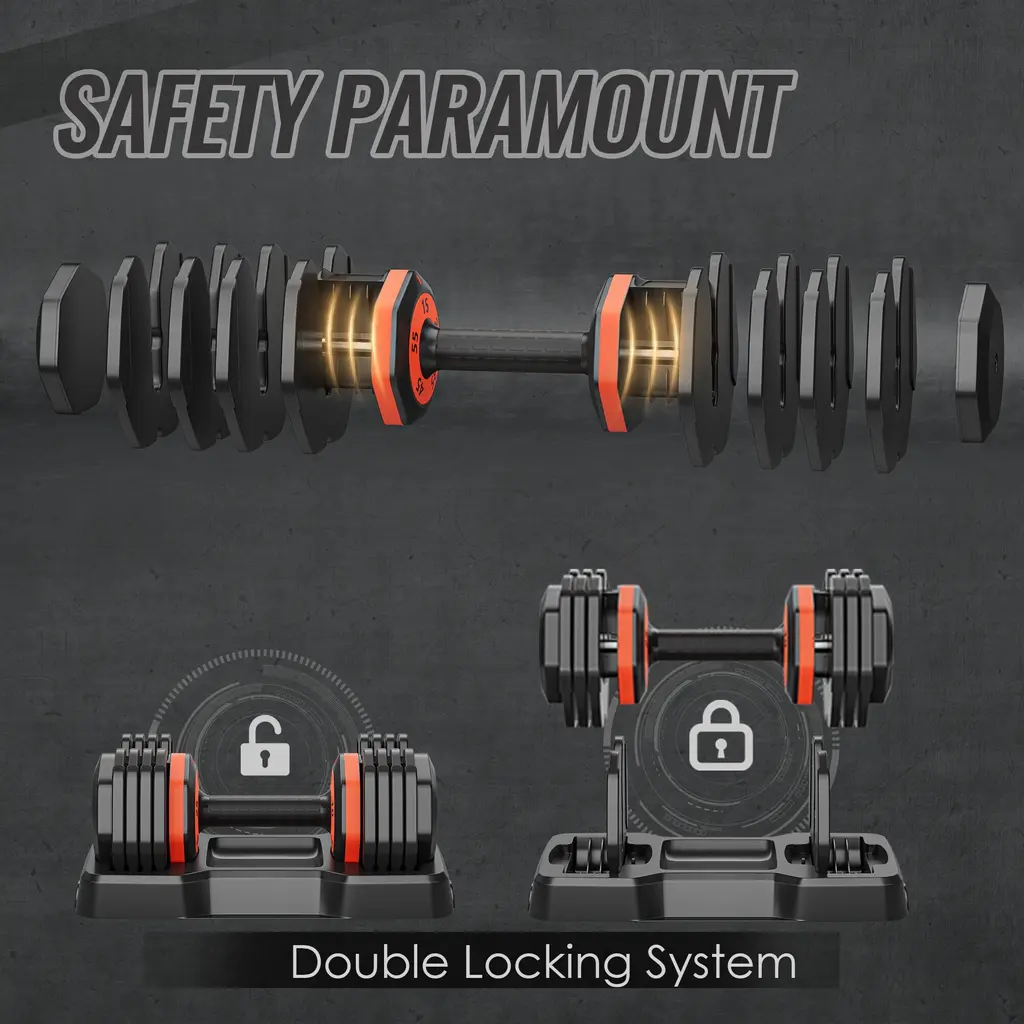Specification:Key Features: Description: This 55LB 5-in-1 single adjustable dumbbell is the perfect solution for full-body home gym workouts. With its innovative design, you can quickly switch between five different weight settings to match your fitness level. The simple one-hand turn handle makes adjustments fast and easy, with a satisfying click sound and a pointer to confirm the change. Ideal for space-saving, this adjustable dumbbell replaces five sets of traditional dumbbells, offering 80% less storage space. The advanced safety structure features double safety buckles on the tray and handle, ensuring stability and secure weight adjustments during exercises. This versatile dumbbell is ideal for targeted muscle building, calorie burning, and improving overall cardiovascular fitness, helping you achieve a balanced and strong physique.