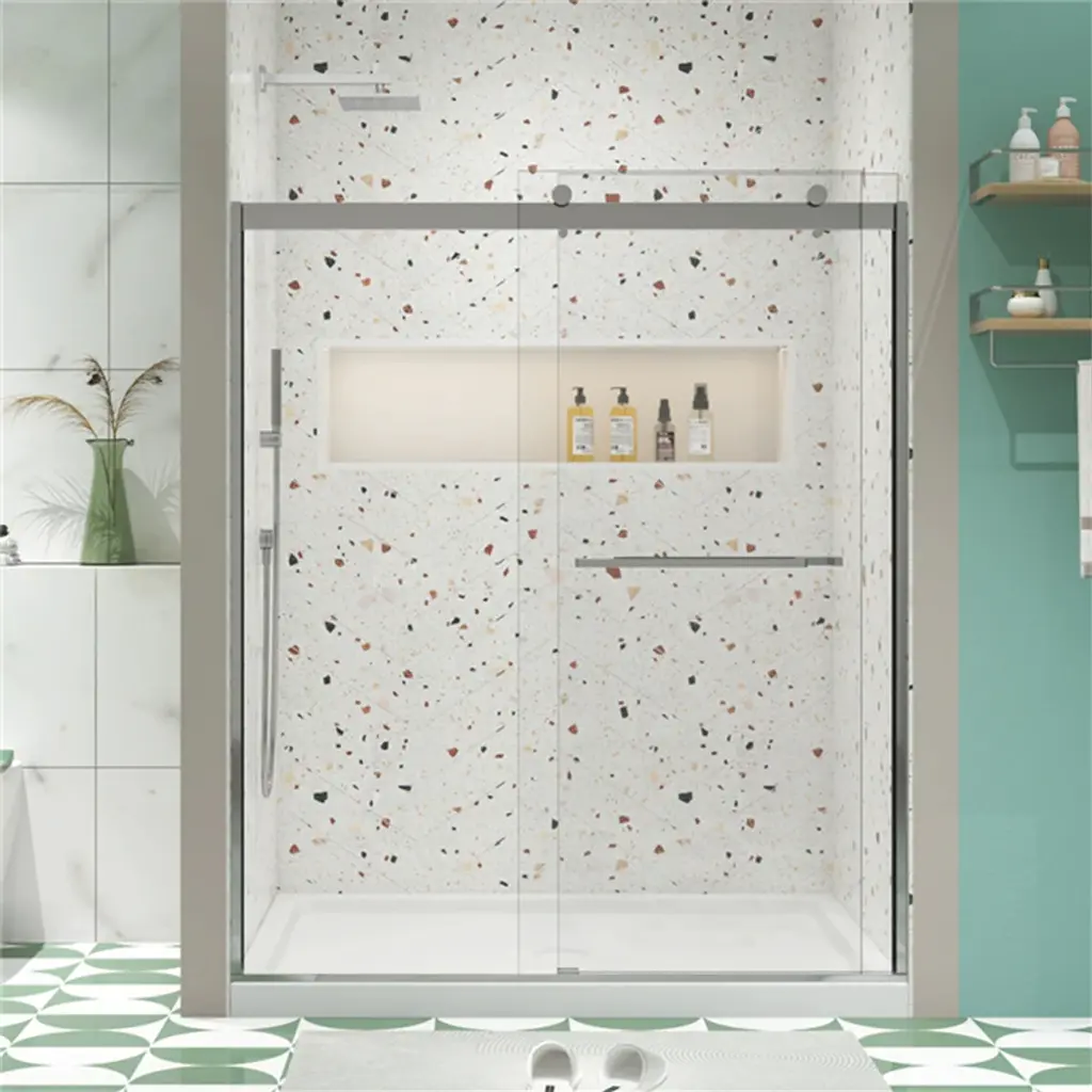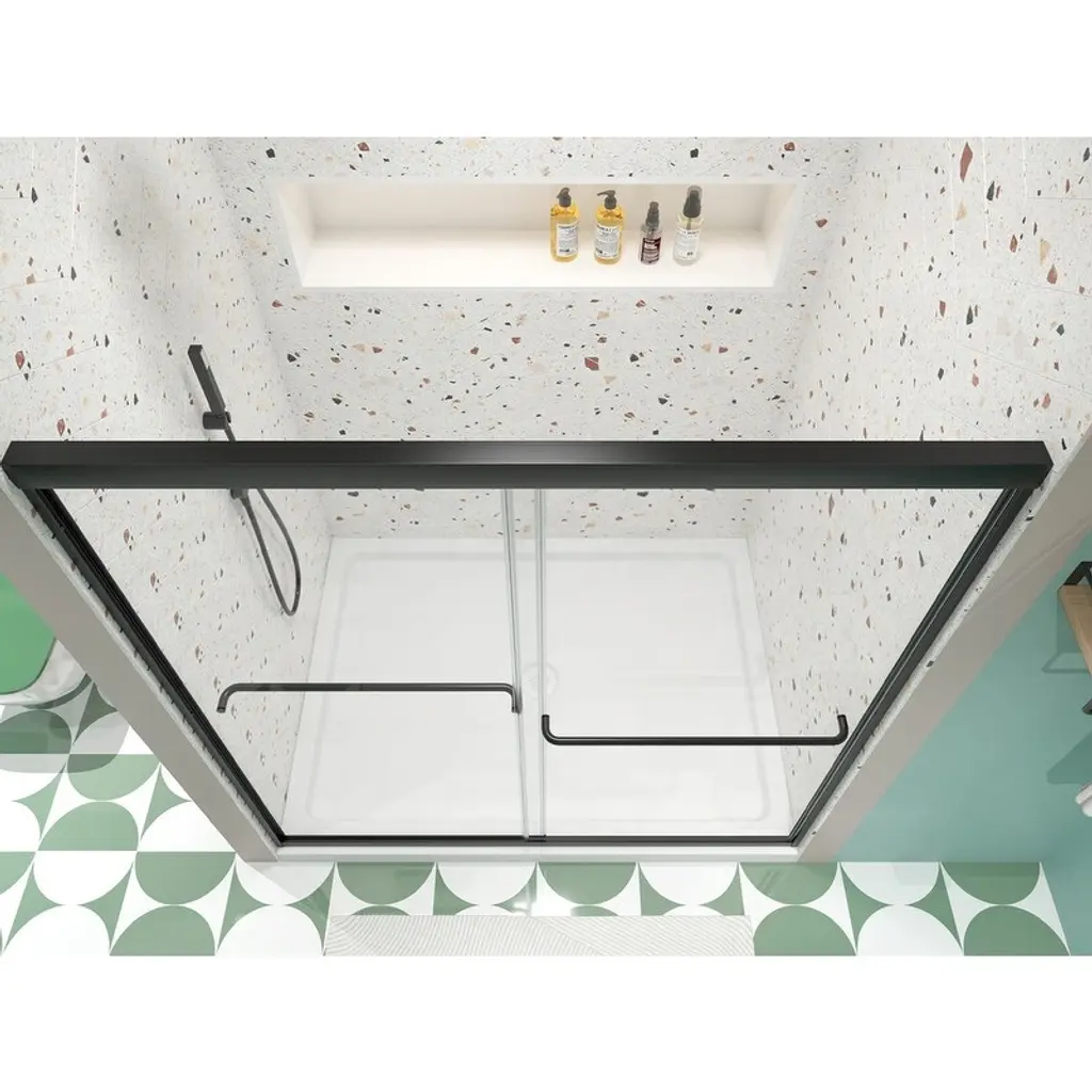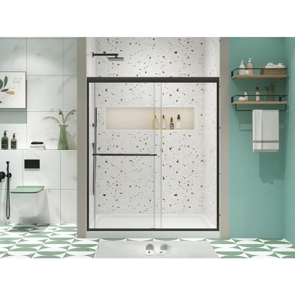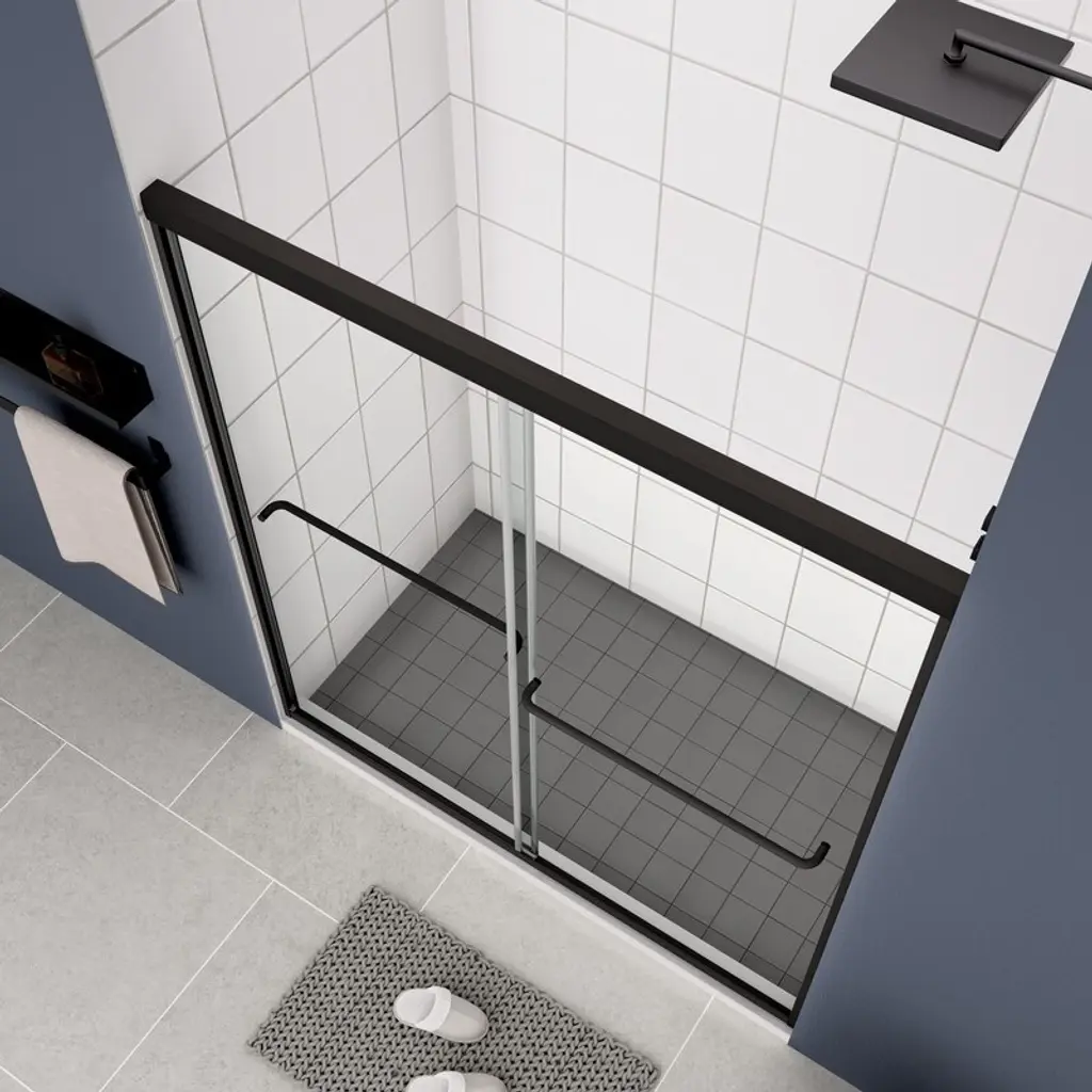 Enhance your shower experience with this premium sliding door, engineered for lasting performance and effortless maintenance. The robust aluminum top track pairs with #304 stainless steel hardware, rigorously tested for 36,000+ smooth open/close cycles to ensure years of reliable use. The durable aluminum frame and 304 stainless steel hardware combine corrosion resistance with minimalist elegance, while 6mm SGCC tempered safety clear glass—featuring an interior nano-coating for effortless cleaning and an exterior explosion-proof film for enhanced safety—ensures lasting clarity and peace of mind. The ultra-smooth sliding system glides quietly for a luxurious feel, while the waterproof seals and a no-left/right distinction simplify installation, letting you achieve a seamless, upscale look in record time. Designed for hassle-free installation and daily convenience, this door combines durability, sleek aesthetics, and smart functionality—perfect for modern bathrooms prioritizing style and practicality. Specifications:Features: What's included?