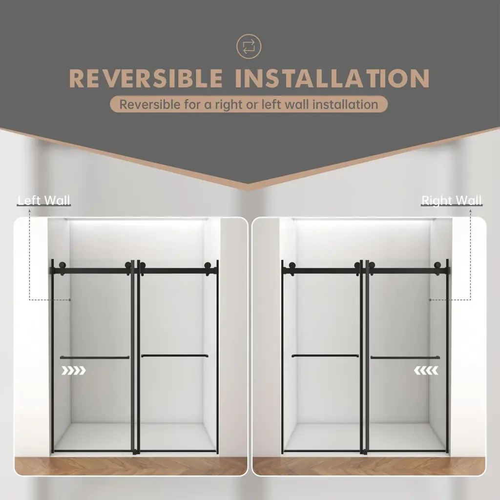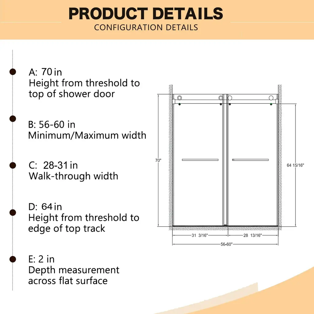 Experience the ultimate showering experience with our 56"-60"W x 70" Frameless Sliding Shower Door. This premium shower enclosure is designed to elevate the style and functionality of your bathroom. Adjustable Width: This high-quality shower door features a 60-inch width that can be adjusted from 56 inches to 60 inches using the cutting guide on the rail, allowing for a customizable fit to your shower space. Frameless Sliding Design: The sleek frameless sliding design enhances the modern aesthetic of your bathroom while providing easy access to the shower. Premium 5/16" Thick Tempered Glass: Crafted from durable 5/16" (8mm) thick tempered glass, this shower enclosure offers exceptional strength, safety, and durability. Towel Bar Included: The shower door comes with a convenient towel bar, providing a practical and stylish solution to hang your towels within reach. Dual-Sided Easy Clean Coating: The glass is coated with a dual-sided easy-clean coating, making it effortless to maintain a sparkling and clear appearance, reducing water stains and soap scum buildup. Soft-Close Buffer: The shower door is equipped with a soft-close buffer mechanism, ensuring a gentle and silent closing motion, preventing any accidental slams and extending the lifespan of the door.