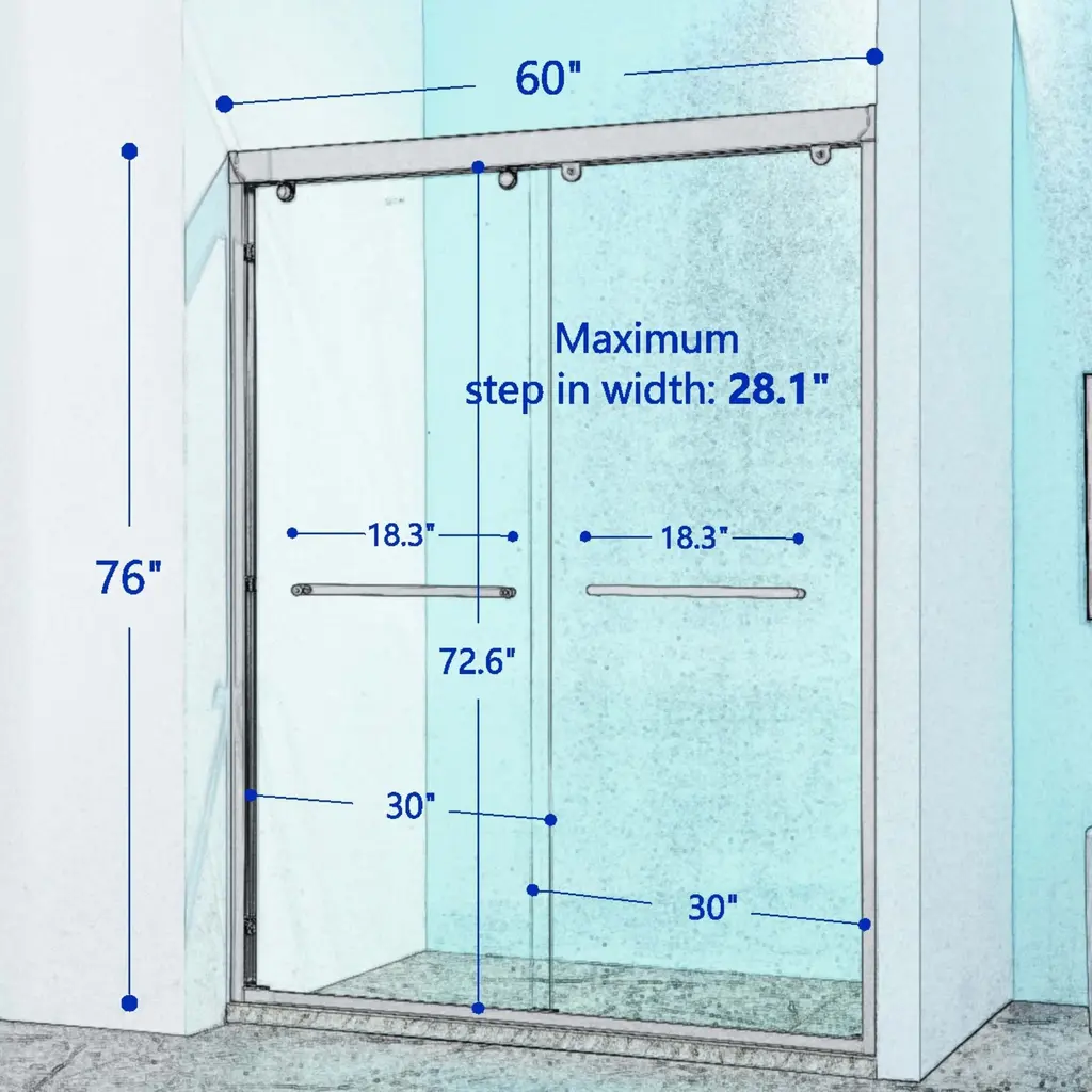 【Product Features】 ★ALUMINIUM ALLOY DOUBLE SLIDING DOOR:Graceful Aluminium alloy frame double sliding door maximizes your bathroom layout. The shower door can be adjusted to 56-60" width by cutting, maximize your bathroom layout. Also support the wall tilt installation within 1/2". ★SAFETY GLASS & STYLISH BATHROOM PARTITION: This product is made of high quality 5/16"(8mm) SGCC & ANSI dual certified Xinyi tempered glass, for impact resistance and high tensile strength, increase the strength of the glass, avoid the splinters splashing hurt. Tempered glass surfaces are smooth and easy to clean and maintain. ★HIGH-QUALITY MATERIALS & SUPER STEADY STUCTRUE: The shower door's main structure is made of lightweight and durable Aluminium alloy with accurate production technology, ensuring the supper stability and durability of the shower door without deformation over time. ★CLASSIC PRETTY APPEARANCE & SOFT CLOSE: Mute stainless steel wheels, with high-tech waterproof paint, which offers excellent corrosion and oxidation resistance, to ensure that your shower door is smooth while keeping silent, with the double sliding design, friendly for easy access while using minimal space. A long mechanical life, with the soft stopper, provide soft and smooth opening and closing during the unobstructed movement. ★ENJOY EASY INSTALLATION: The complete packaging of the shower door includes all necessary components, ensuring a smooth and unobstructed installation process. And the packaging comes with an easy to understand Assembly Instruction that covers component preparation and step-by-step installation. A detailed Video Installation Guide is also included to make each assembly step precise and enjoyable. 【This product is fragile, if there is any damage when you receive the goods, please take a photo and contact us, so that we can quickly verify and deal with you】 【Notes】 1.Size Notice:Manual measurement has been used, there may be some reasonable errort, thanks for your understanding. 2.Color Notice:Due to factors such as display equipment and shooting environment, the color of the item may be slightly different from the picture, which is a normal phenomenon, please refer to the actual item 3.Assembly Notice:Please read assemble manual in advance. Please do not over-tighten nuts, as this may cause distortion or breakage. 4.It is recommended to put a layer of foam or soft cushion on the floor when installing to avoid scratching the floor. 5.If the item has any defects, damage or missing parts, please contact us with pictures or videos so that we can understand your needs and help you quickly, and always remember to retain its original packaging to ensure any return requests. We will try our best to solve any problems you may have. 6.If you receive the wrong product, please attach the product picture, the infographic of the outer package and the picture containing SKUs, so that we can verify and quickly deal with it for you