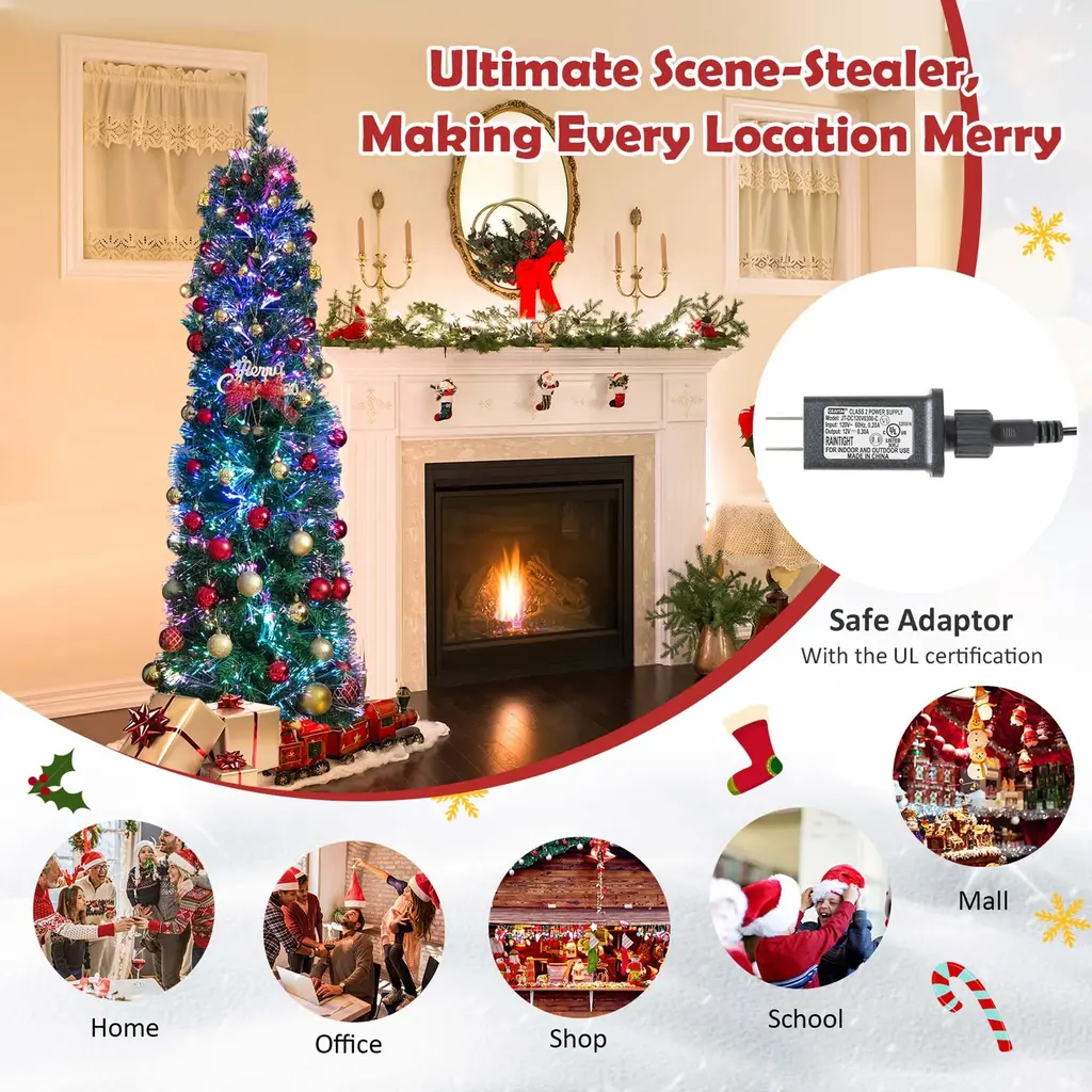 The Xmas tree is the ultimate scene-stealer, making every location merry! Thanks to 361/517/697/889 evergreen branch tips, the Christmas tree looks realistic. Also, it comes with colorful fiber optics that offer a charming lighting show. By the way, the UL certificated adaptor is included for higher security. Since the artificial tree is made of premium PVC, it is fireproof, non-allergic & has no weird smells. For small rooms, the Xmas tree is a perfect choice, since its slim pencil shape can fit into any corner. Finally, the Christmas tree is easy to assemble & its folding metal stand will maintain perfect stability. Ornaments are not included. Features:Specification