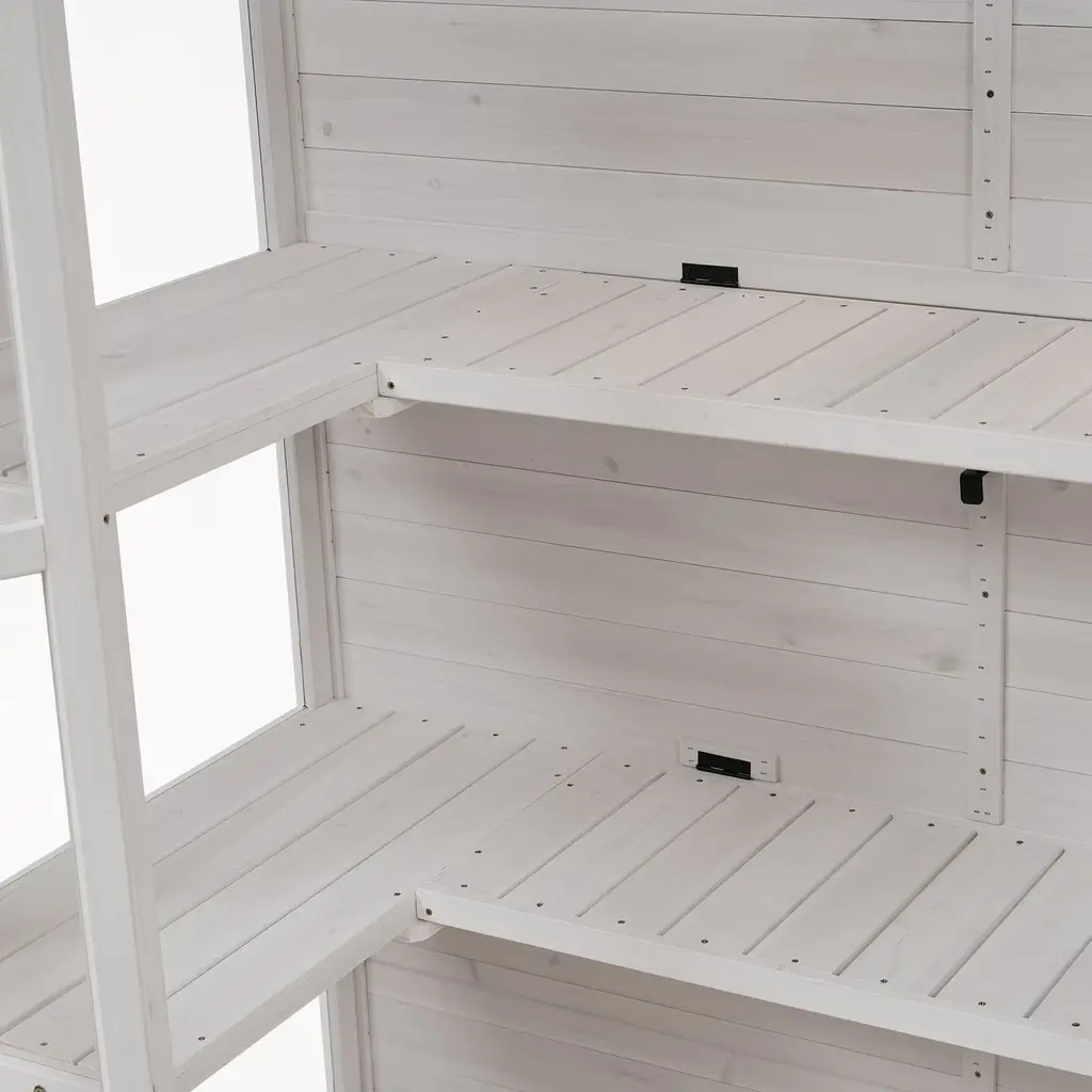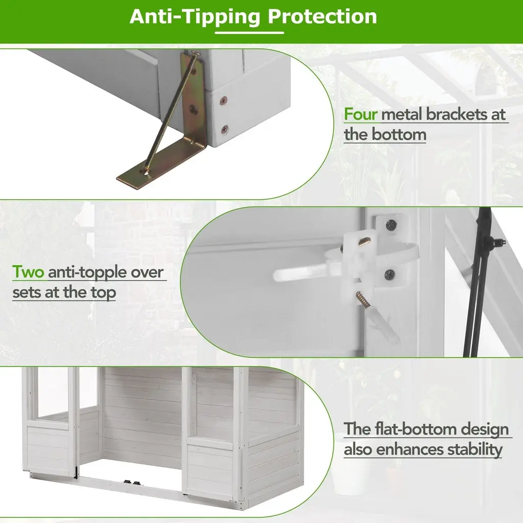 Wood has a natural beauty and warm appearance, adding a natural and comfortable atmosphere to the greenhouse, integrating it into the surrounding environment, and becoming a decorative element for gardens or farms.Polycarbonate panels have excellent transparency, allowing a large amount of sunlight to pass through and evenly distributed in the greenhouse, promoting plant growth and prosperity.[Walk-in Greenhouse] Crafted from sturdy fir wood, this wooden greenhouse boasts meticulous construction, ensuring an appealing aesthetic. With dimensions of 57.9x29.1x78.1 inches, it provides ample space for people to walk in, making it convenient for tending to various gardening tasks. Double-sided door design makes it easy to go into the roomy interior, which is perfect for accommodating an abundance of plants and essential tools.[Two Folding Middle Shelves] The greenhouse is thoughtfully designed with two shelves. Featuring two folding middle shelves, you have the flexibility to arrange them up or down according to your preference, making organization a breeze. Side shelves offer a practical solution for organizing your plants, providing expansive storage space for you. The shelf height ensures that plants could find a suitable and comfortable spot for growth.[Polycarbonate Panels] Featuring 4 skylights for effective ventilation and a front display window made of polycarbonate panels, this greenhouse prioritizes optimal light penetration. Polycarbonate material enhances transparency, allowing plants to bask in sunlight. The positioned skylights promote excellent airflow, contributing to a well-ventilated environment that fosters the health and growth of the plants within.[Anti-Fall Protection] Four metal brackets at the bottom, coupled with two anti-topple over sets at the top, guarantee stability and top-to-bottom anti-risk capability. The flat-bottom design also enhances stability, eliminating unnecessary rocking. The hollow bottom offers the flexibility to strategically place heavier items in the center, preventing potential structural damage and promoting the greenhouse's long-term durability.[Dimensions and Warranty] Overall dimension: 57.9x29.1x78.1 inch(LxWxH); Middle Shelf: 28.8x13 inch(LxWxH); Side Shelf: 27.2x14.4 inch(LxWxH); Lower Shelf to ground:33 inch. For more size, please refer to the size image. Warm Notice: 3 boxes in total which may not come together.