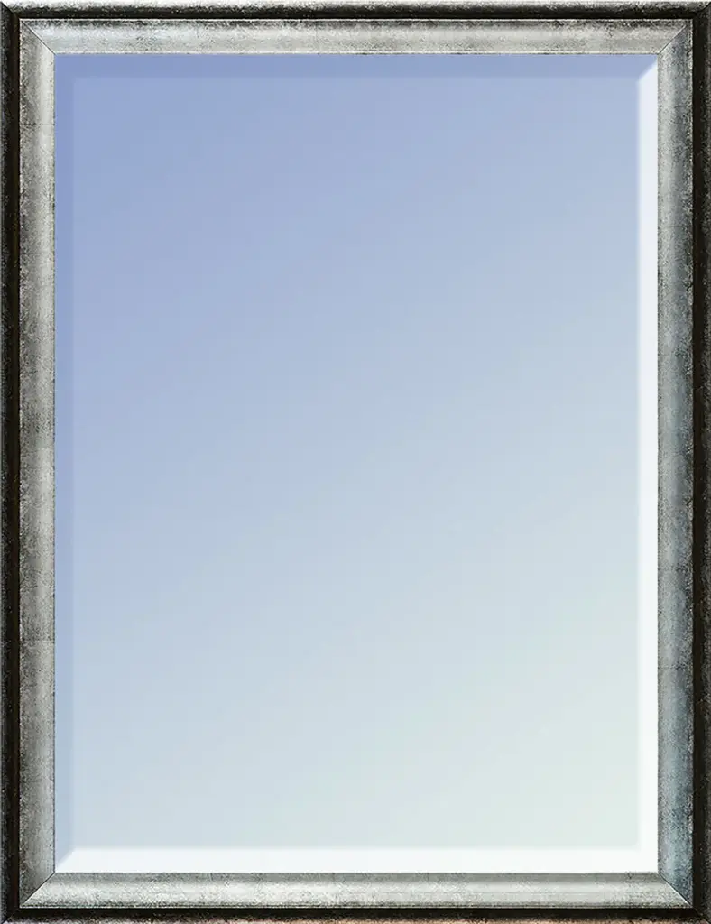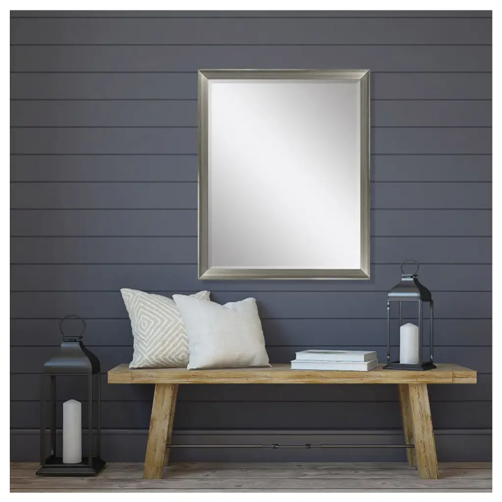 Elegant beveled mirror is framed in a brushed silver finish moulding.