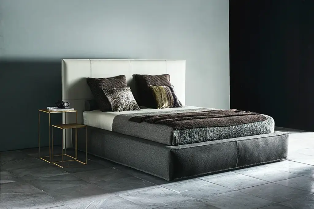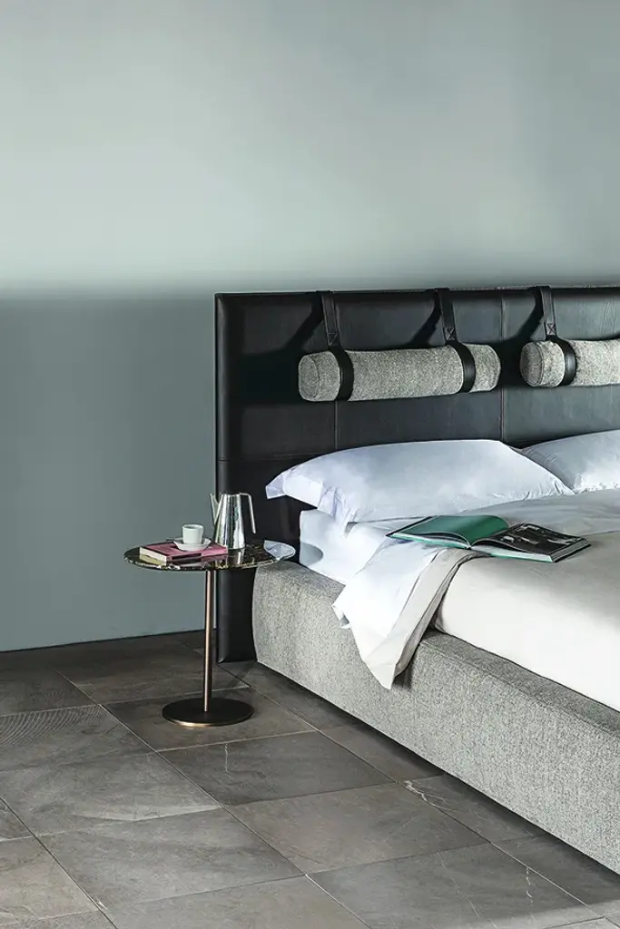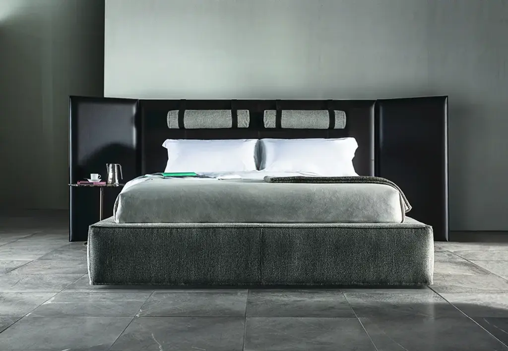 Vibieffe 5800 Tube is a large double bed, available in different sizes and with completely removable cotton, linen, leather or custom covers. A headrest with outward opening leather panels and an adjustable tubular headrest characterize the 5800 Tube bed. The bed base can be lifted to access the storage space underneath. 5800 Tube has a wood plastic composite and plywood frame and has been designed with the utmost attention to style, fineness, quality and care for details that are typical of Interior Design Made in Italy.5800 Tube is an outstanding bed: its headrest has leather panels that can be opened outward, designing your bedroom with sophisticated and elegant style. The 5800 Tube come with an adjustable tubular headrest, particularly comfortable. The bed base is very large and the lifting mechanism to access the underneath storage space comes in two variants: Simple, a frontal lifting mechanism (it opens from the end of the bed) and Patrik, a vertical lifting mechanism (parallel to the floor).This bed, in the storage version, is equipped with the Up&Down mechanism that allows you to adjust the mattress at your favourite height and also with Flat, the beechwood slatted orthopedic bed base with a steel frame, suitable for every Vibieffe mattress.5800 Tube can be covered with an endless range of fabrics in the trendiest colours. Covers are available in the most requested materials: leather, cotton, linen, all of which are top quality handcrafted, sartorial products. The base and headrest padding is made of polyurethane foam wrapped with thermal bonded fibre. The headrest panel is made of plywood covered by polyurethane foam wrapped with a thermal bonded fibre; the headrest can be reclined thanks to an adjustable hinge.Designed to furnish bedrooms, 5800 Tube is the ideal bed also for guest rooms, holiday houses, hotels, self-catering apartments.Vibieffe manufactures sofas, armchairs, sofa beds, beds and furnishing accessories in Lissone and provides solutions for the interior design made in Italy for your home, holiday houses, villas, hotels and self-catering apartments.Technical featuresFrame: composite woods and multilayerBase padding: polyurethane foam covered with heated bonded polyester fibreHeadboard: shaped multilayer wood covered with emery leatherFeet: black standardFrame cover: fabric or leather coverFabric cover completely removable