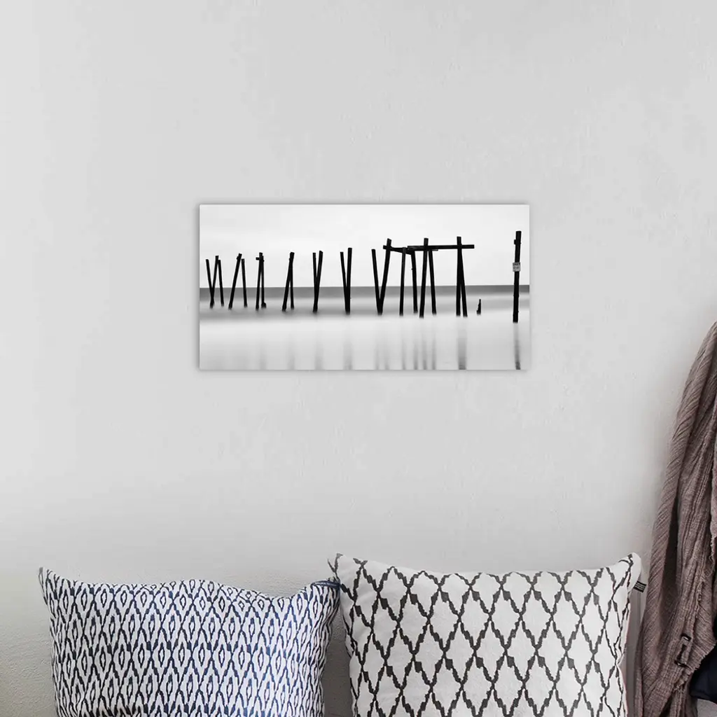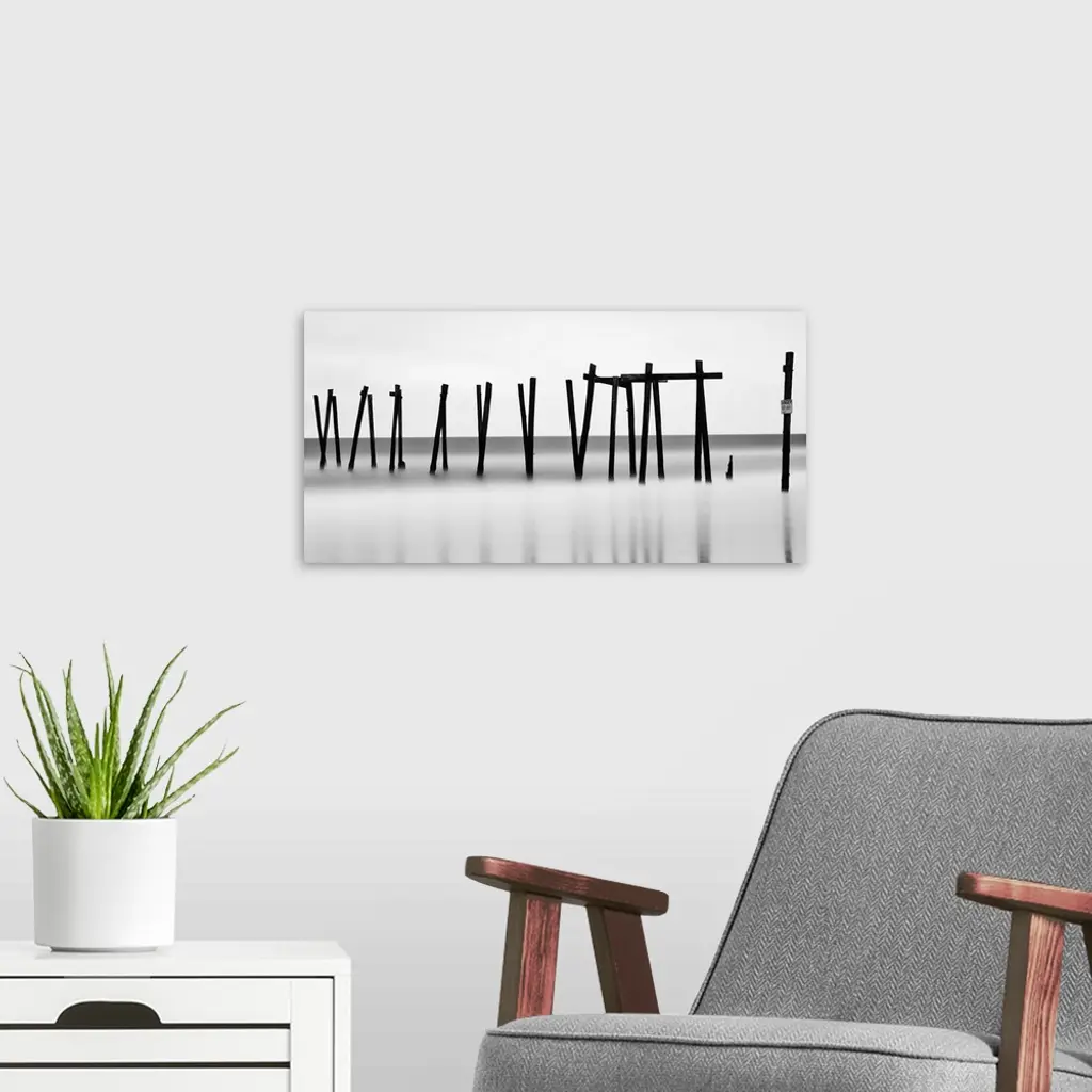 Old wooden pilings from a long-gone pier standing in the hazy ocean, Ocean City, New Jersey.