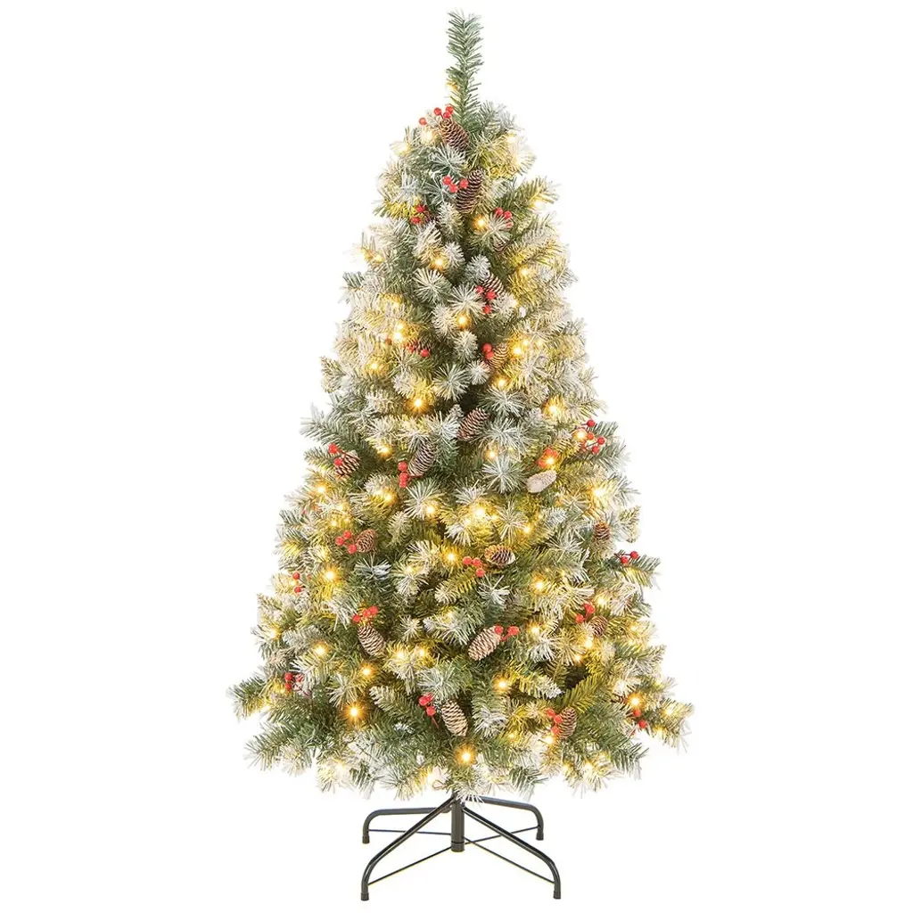 ▌ PRODUCT DETAILS: Description: Create a rustic & elegant holiday atmosphere with this lifelike 5 ft Xmas tree. It will imitate real trees down to the finest details. With 450 mixed branch tips, it mimics the natural shape & texture of real trees, while 42 pine cones & 126 red berries add a charming touch. Illuminate your festivities with 200 LED lights that emit a warm white glow, creating a magical ambiance without consuming too much energy or overheating. Choose from 8 different lighting modes (like combination, sequential, chasing/flash, etc), with the tree remembering the last mode used. Made from safe & durable PVC material, it is fireproof, non-fading & non-allergic, while remaining vibrant & has no weird smells. The hinged design allows for hassle-free setup, while the folding metal stand ensures stability. Perfect for homes, offices, malls, or even carnivals, the Xmas tree is a versatile & captivating addition to your holiday decorations. Features: 450 snowy branch tips to perform a luxuriant tree shape With lush mixed leaves to achieve perfect simulation 42 natural pine cones as presents from the nature 126 vivid red berries make the Xmas tree more adorable Superior PVC with fire resistance, fade resistance & allergic resistance 200 warm white LED lights with 8 dynamic modes, like in waves, slo-glo or slow fade Memory function will restore previous mode upon startup Hinged connections make the 2-section frame easy to assemble Folding metal stand with anti-slip foot pads for great stability Safe adaptor with a button to change the lighting mode Deliver your best wishes in the office, home, shop, mall and more Please note that ornaments are not included Specifications: Color: Green & White Material: PVC, Pine Cones, Metal Tree Height: 5 ft Tree Width: 2.7 ft Diameter of Stand: 16" Number of Sections: 2 Number of Branch Tips: 450 Number of LED Lights: 200 Number of Pine Cones: 42 Number of Red Berries: 126 Net Weight: 10 lbs Package Include: 1 x Artificial Xmas Tree 1 x User Guide